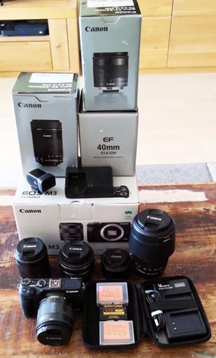 Canon EOS M3 mit 5 Objektiven 18-55 , EVF-DC1 , EF-M 11-22, EF-M 22, EF-S 55-250, EF/EF-S Adapter