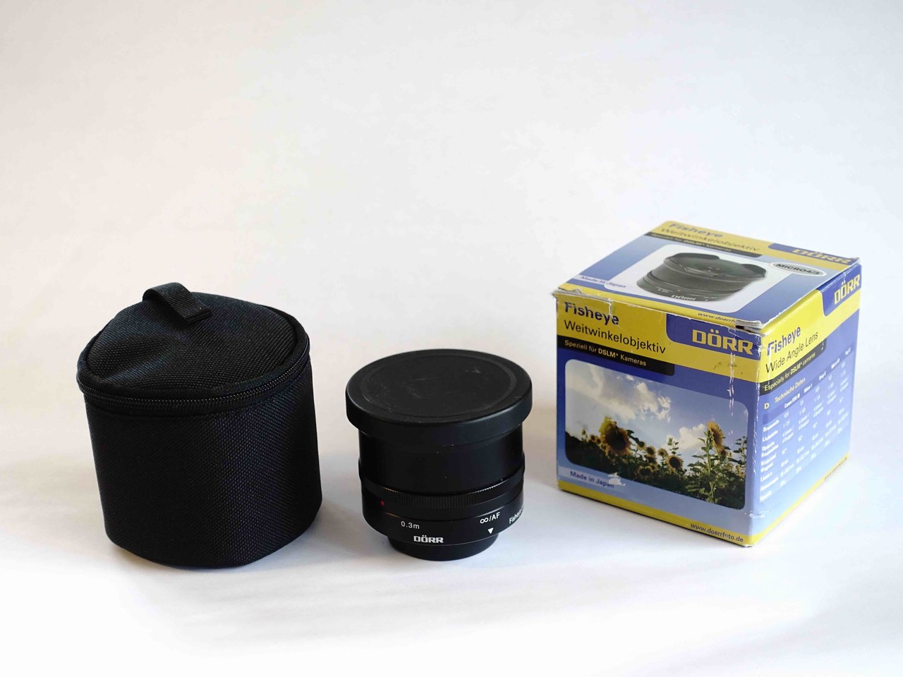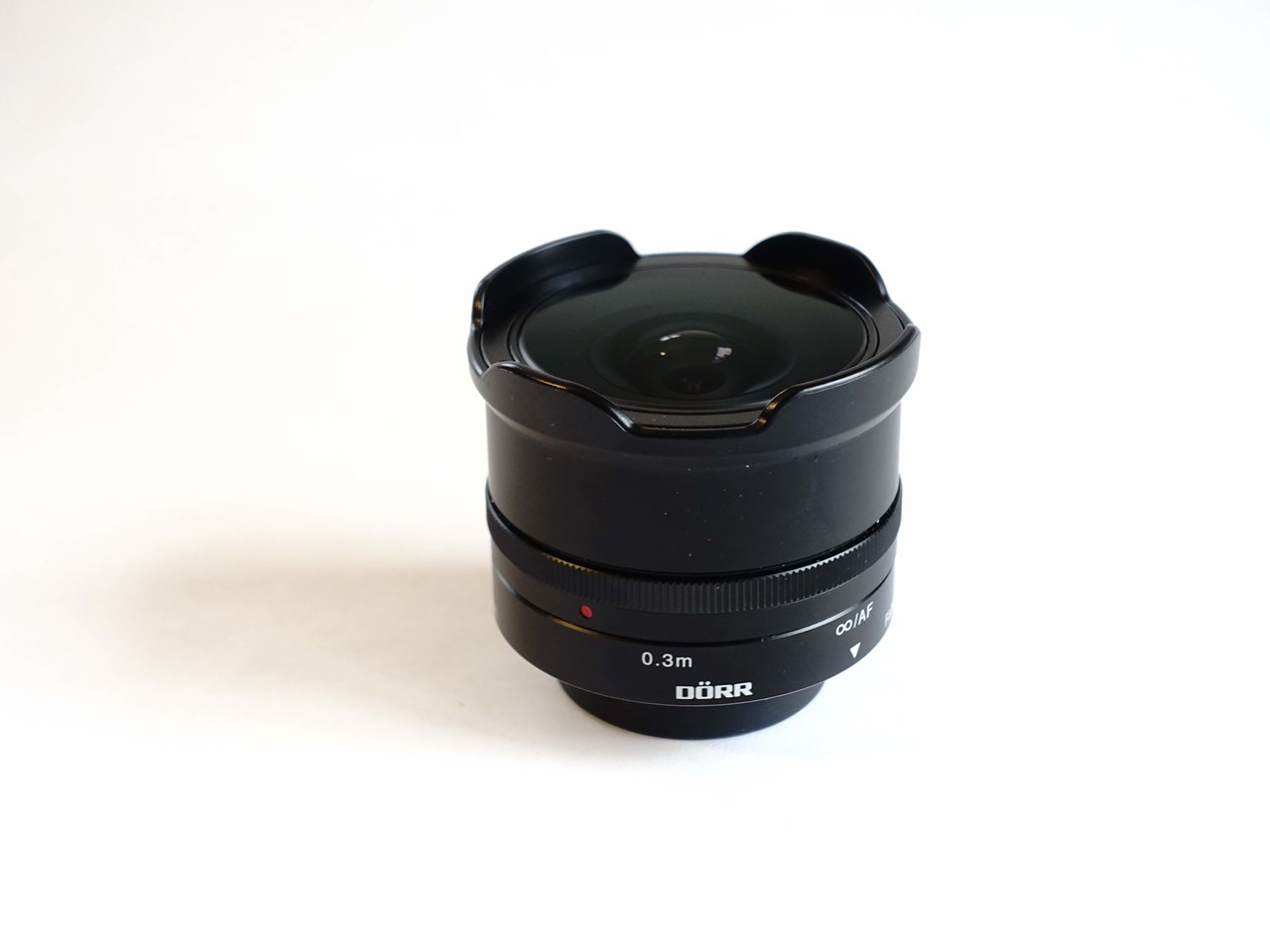 9,3 mm Brennweite, 1:8,0 Lichtstärke, 168° Bildwinkel diagonal, fest eingebaute Gegenlichtblende, Mehrschichtvergütung