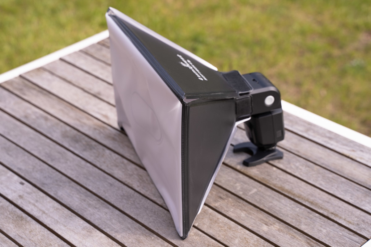 Flach zusammengefaltet ist sie nur ca. 1cm dick und bietet eine Leuchtfläche von 34x23cm. Befestigt wird sie am Blitz mittels Ultrastrap, der einfach mittels Gummi und Klett um den Blitz gewickelt wird. Aufbau in null komma nix!