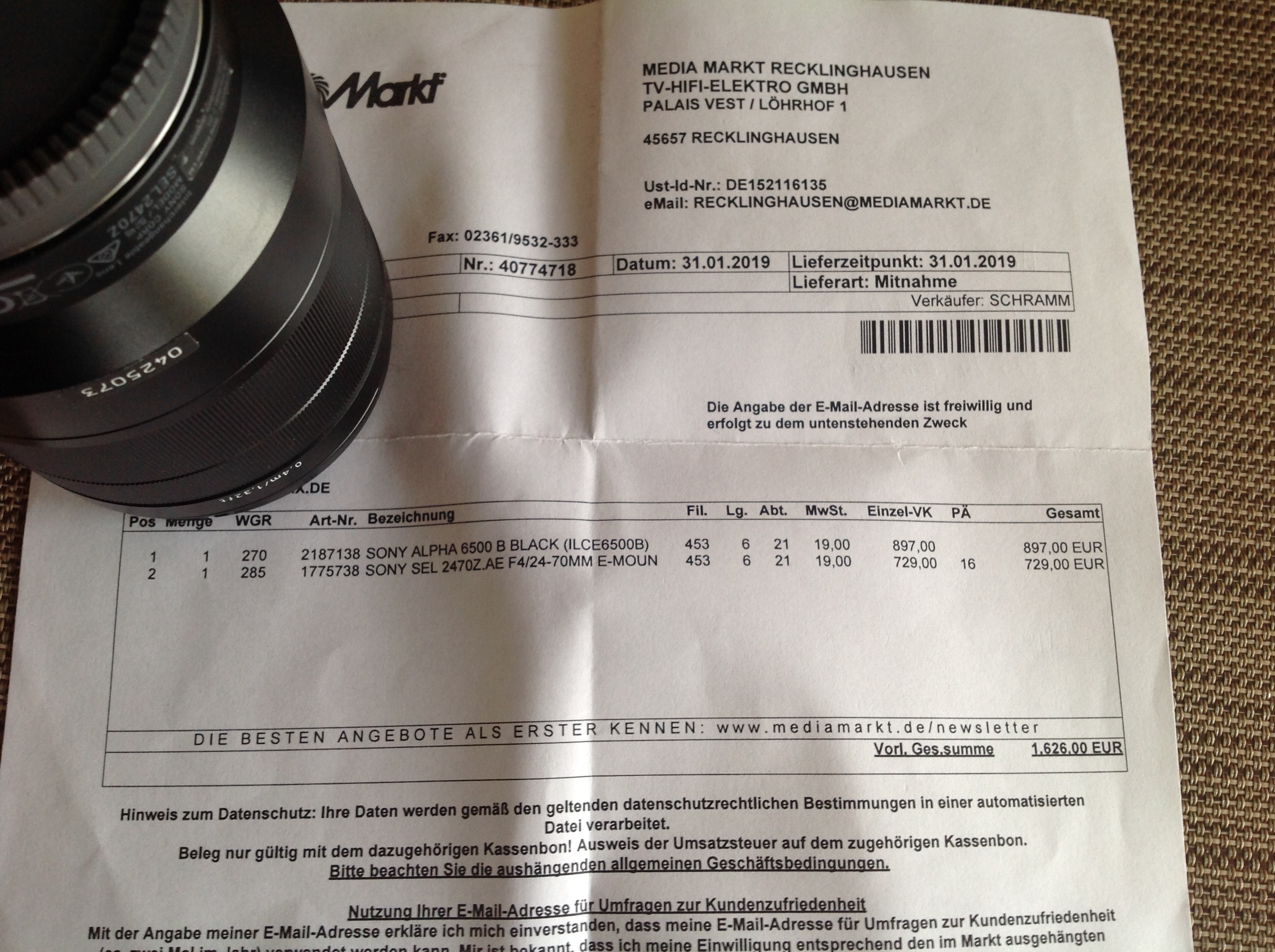 Das Objektiv wurde am 31.01.2019 beim Media Markt gekauft.