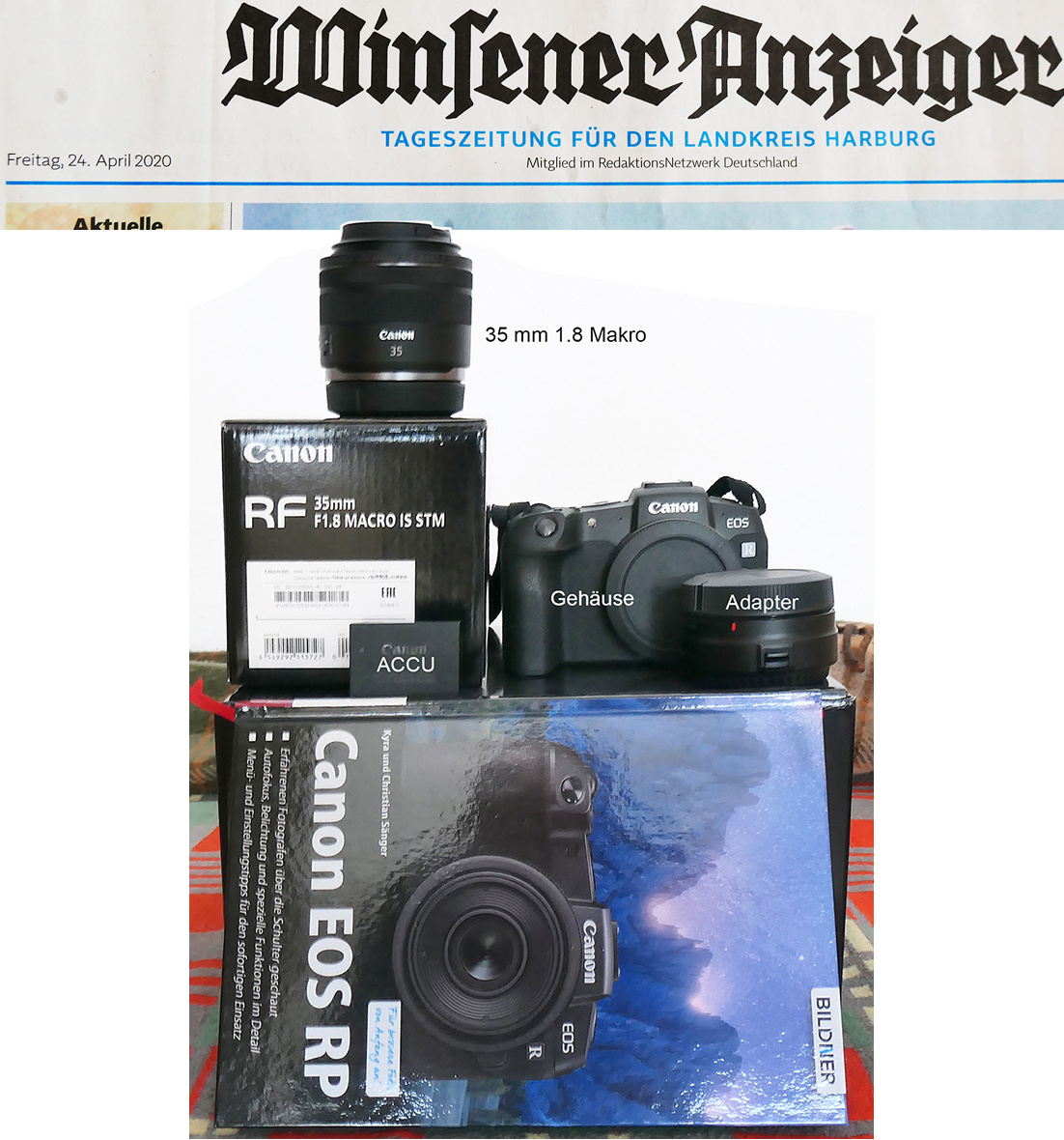 Canon EOS RP mit EF-Adapter für EF-Objektive. Objektiv RF 35 mm 1.8 IS Makro STM. Canon Zweit-Accu LP E-17. Canon Buch EOS RP vom Verlag Bildner. Im Dezember 2019 gekauft. Es gilt noch 7 Monate die Garantie, also wie neu. Fast nicht benutzt, etwa 80 Auslösungen. Sehr günstig erworben, deshalb dieser günstige Preis. Zusammen für 1.280 Euro per Vorkasse oder Nachnahme. kjans@web.de.