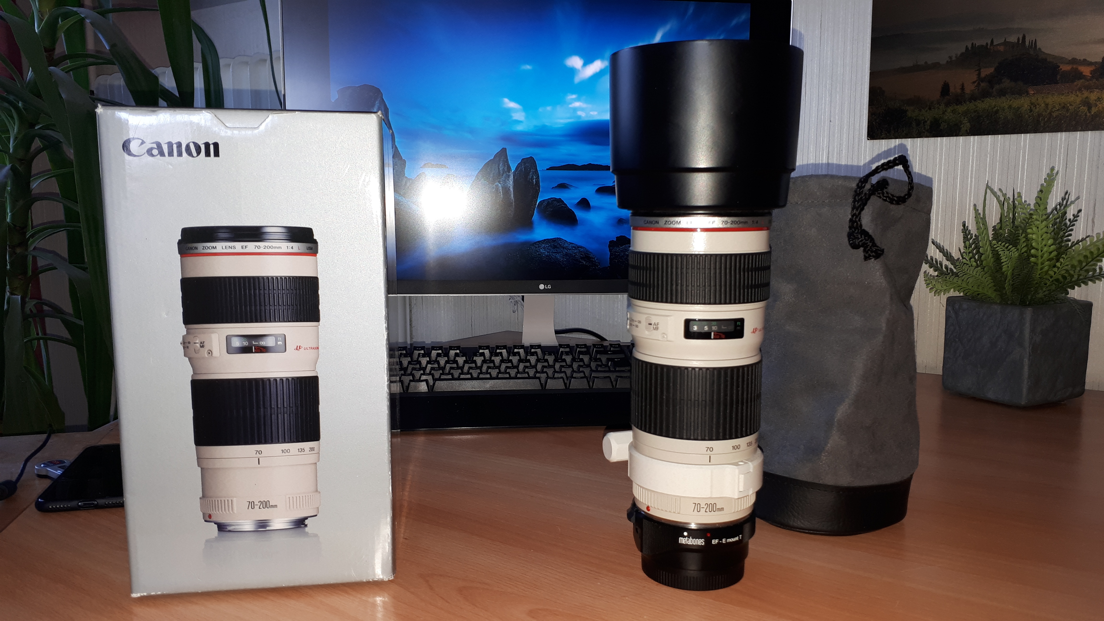 ich verkaufe hier mein Canon 70-200 F4 L USM Telezoom – Objektiv (ohne Bildstabilisator) mit einer durchgehenden Blende von F4 mit dem Metabones Mark IV Adapter von Canon Mount auf Sony E-Mount.
