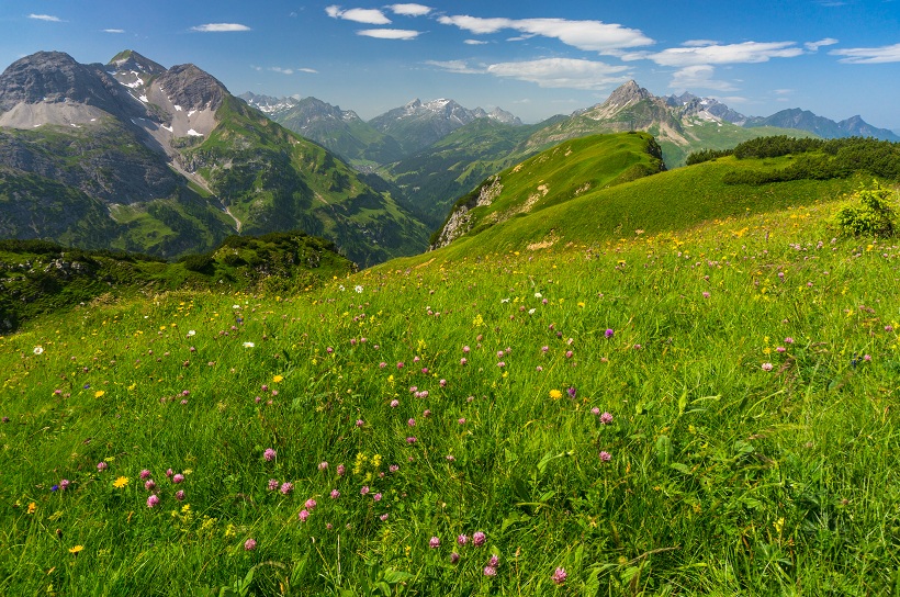 Im Abstieg vom Biberkopf (2,599 m), der Grasbuckel rechts heißt "Hundskopf". Die Ortschaft weiter hinten im Tal ist der berühmte Wintersportort Lech am Arlberg.