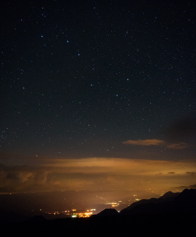 Sternenhimmel am 10.8.2013, gesehen knapp unterhalb vom Kreuzeck (2376 m) in den Allgäuer Alpen. Der Ort unten ist Oberstdorf.