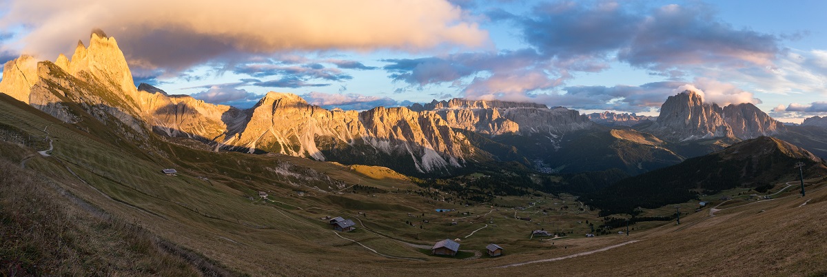 Blick von knapp unterhalb der Seceda (2519 m) in Richtung Geislergruppe, Langkofel und Grödnertal.