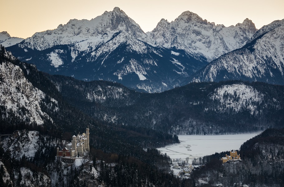 Die Königsschlösser Neuschwanstein und Hohenschwangau vor den Tannheimer Bergen.