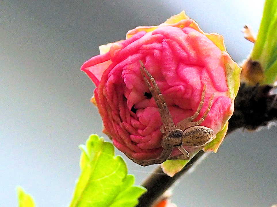 die winzige Spinne klammerte sich unten an der Mandelblütenknospe fest
