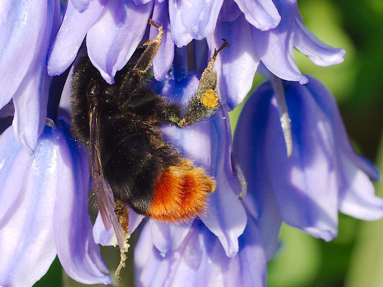 die Hummel ist zu groß, um in der Blüte zu verschwinden, so sieht man noch ihren wunderschönen Pelz