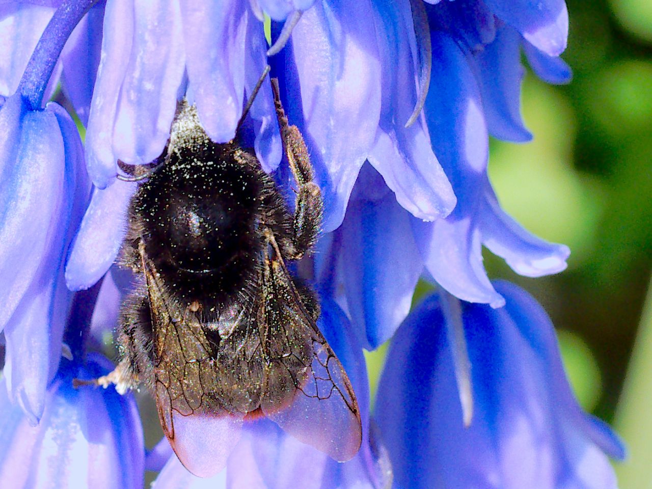 die Sonne lässt den Blütenstaub auf der Hummel glitzern, als wäre sie mit Glitter bestäubt