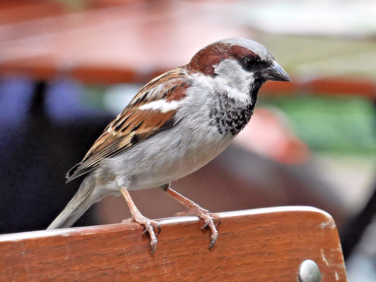 von der Stuhllehne aus hatte dieser Spatz das Menschenessen fest im Blick