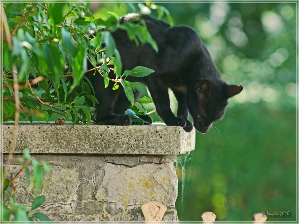 Schwarzer Panther. Unser kleiner Kater schaut, wie er wieder von dem Torpfosten herunterkommt. G1 mit Canon FD 2.5/135mm, Blende 4, 80stel Sekunde.