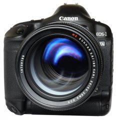 Canon EOS 1Ds Mark II mit riesigem Carl Zeiss Jena f2,8/180mm aufgenommen mit der kleinen GF1 und 14-45mm Kitobjektiv bei 45mm und f16