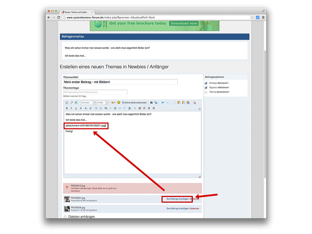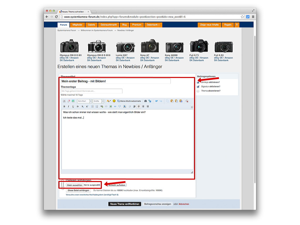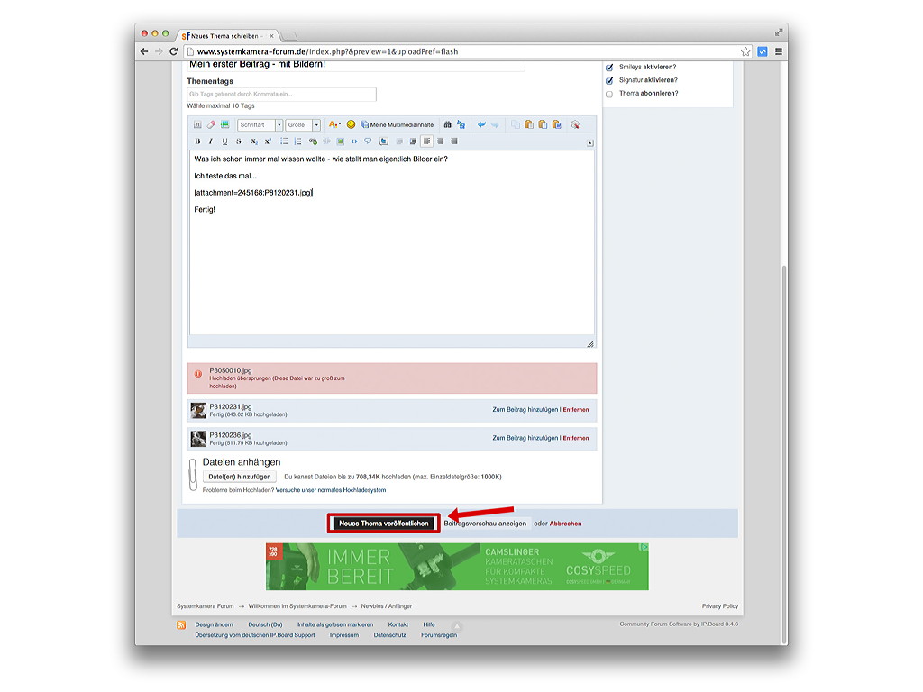 Beim Aufräumen stieß ich auf einen Beitrag, in dem das Posten und Bilder hochladen beschrieben wurde - mit der alten Forensoftware... Hier ist jetzt eine aktualisierte Version! Falls Ihr Fehler findet oder nicht damit klarkommt, bitte kurze Nachricht an mich oder in diesem Thread antworten. Schritt 1: Richtiges Forum finden Wir nehmen als Beispiel mal das Newbies Forum: Schritt 2: Neues Thema erstellen Einmal klicken bitte: Schritt 3: Titel und Text eingeben, Bild Upload Jeder Thread braucht Titel und Inhalt. Wenn Ihr Bilder verwenden wollt, müsst Ihr unten auf "Datei auswählen" klicken. Falls Ihr keine Bilder braucht, geht es unten mit Schritt 6 weiter. Schritt 4: Bild für den Upload auswählen Bei Bedarf können es auch mehrere sein. Schritt 5: Zum Beitrag hinzufügen Wenn Ihr diesen Schritt nicht macht, wird das Bild am Ende des Beitrags angehängt. So könnt Ihr das Bild an der richtigen Stelle einfügen: Schritt 6: Beitrag veröffentlichen Wenn alles fertig ist, „Neues Thema veröffentlichen“ klicken: Fertig! So sähe das dann aus: Live ist dieser Beitrag hier. Fragen? Gerne hier im Thread stellen oder mir eine PN schicken. Gruß Andreas