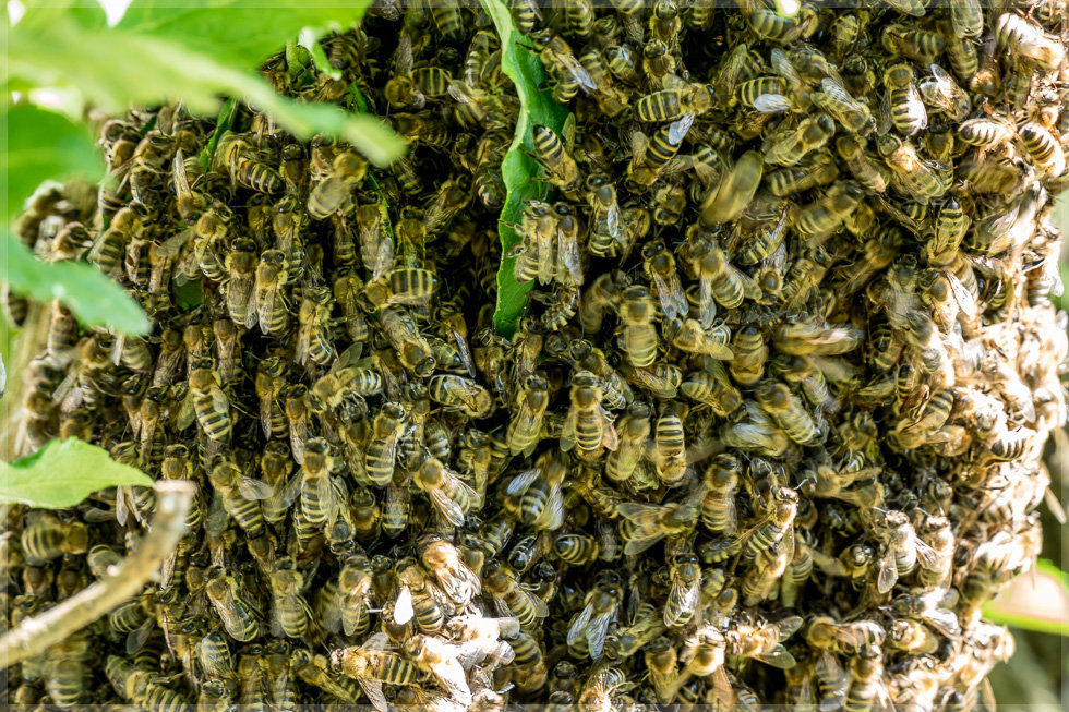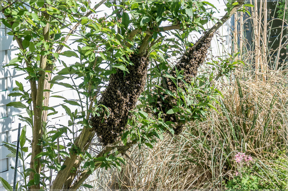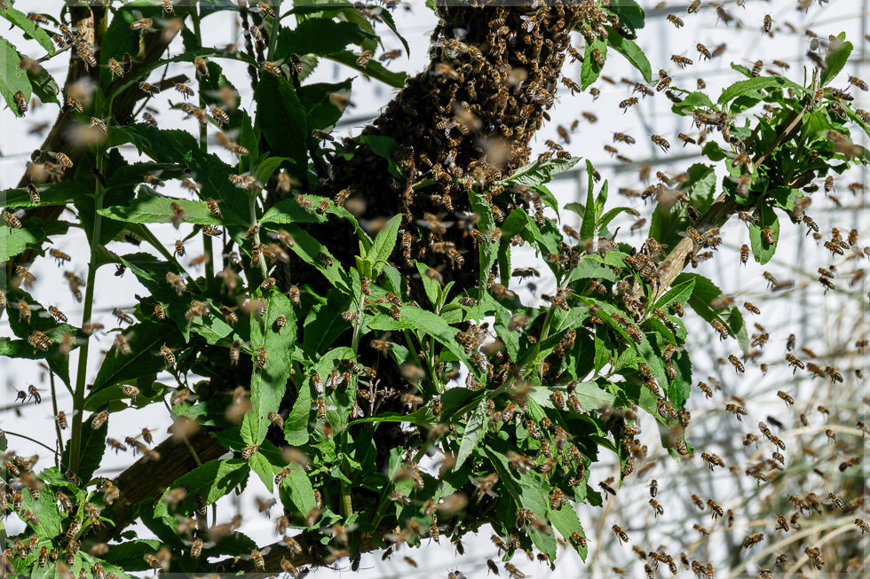 Die Bienen züchten Königinnen heran und dann fliegt ein Teil mit der alten Königin davon.