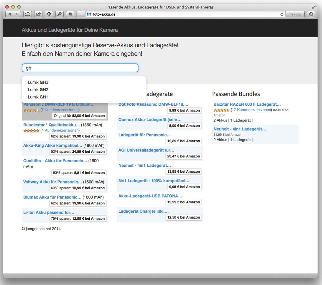Wir haben da was entwickelt - und würden gerne Eure Meinung hören... Auf der neuen Website foto-akku.de bieten wir eine (oder eigentlich zwei) einfache Suchmöglichkeiten an, um zu jeder gängigen Systemkamera (DSLR und SLT haben wir auch im Angebot) schnell den passenden Original-Akku zu finden - plus: Günstige Alternativen von anderen Herstellern Passende Ladegeräte Interessante Bundles aus Ladegeräten und Akkus Wir haben das in zwei verschiedenen Varianten gebaut: Einmal zum Eintippen (TypeAhead für Experten): Einmal über zwei DropDown Menüs: Meine Frage an Euch: Ist das nützlich? Welche Version findet Ihr besser? Sind zu viele oder zu wenige Infos dargestellt? Was wir schon wissen:Es sind noch nicht alle Kameras erfasst Es fehlen für einige Kameras noch Bundleangebote Einige Bundles sind falsch bei den Ladegeräten einsortiert Und weil die Frage in einem anderen Thread schon kam: Für SD-Karten haben wir auch schon was! Noch andere Ideen? Wir haben noch das sexy Thema „Displayschutzfolien“ in der Pipeline Ich freue mich über Feedback! Gruß Andreas