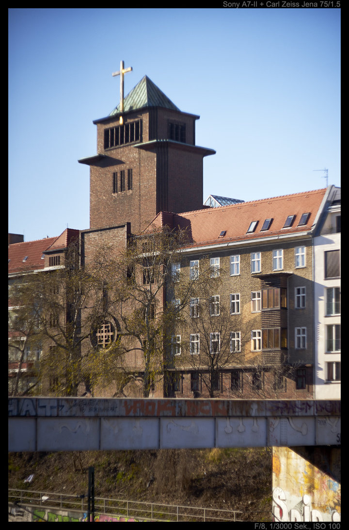Das Geschäftsmodell des gegenwärtig unter dem Namen "Meyer Görlitz" firmierenden Unternehmens ist offenkundig ein Erfolg. Die per Crowdfunding und Subskription angebotenen Objektive gehen weg wie geschnitten Brot. Das hat auch Nachahmer auf den Plan gerufen - etwa Lomo mit seinem Steckblenden-Pdtzval 85 Art. Jetzt ahmen sich die Leute von Neu-Meyer sogar selbst nach und bringen unter anderer Firma einen Nachbau des berühmten "Nachtobjektivs" Zeiss Biotar 75mm 1.5 heraus. Zeiss dürfen sie es natürlich nicht nennen, aber den Namen "Biotar" haben sie an sich bringen können. Als gemäßigter Liebhaber von Altglas finde ich das schon spannend und hoffe, daß wir hier einiges an Infos und Meinungen zum Thema zusammentragen können. Einen Faden mit benachbartem Thema gibt es bereits hier: Alte Objektive (~50+) und ihre Besonderheiten, außerdem haben inzwischen die meisten Meyer-Görtlitz Linsen ihre eigenen Threads bekommen, auch die Prakticare sind gut vertreten. Hier eine Aufnahme mit dem Biotar, spätnachmittags im Frühjahr, nur korrekt entwickelt, nicht optimiert. Selbst bei Blende 8 geht es außerhalb des Zentrums zienlich wild zu. Nachträgliche Korrektur: Zu den Aufnahmedaten: Das war keinesfalls Blende 8. Ich habe jetzt sorgfältiger protokollierte Aufnahmeserien gemacht - danach war das Offenblende oder F2. Sobald die Aufnahmen der aktuellen Serie aufbereitet sind, werde ich einige davon posten. Zum Objektiv: Klar - das ist ein altes Biotar T, und zwar der im Web verbreiteten Nummernliste nach aus dem Produktionszeitraum 1949-52. Ich habe noch eines ohne "T", das fällt nach 1959/60. Das neue gibt es noch gar nicht - dafür werden erst Vorbestellungen gesammelt. -