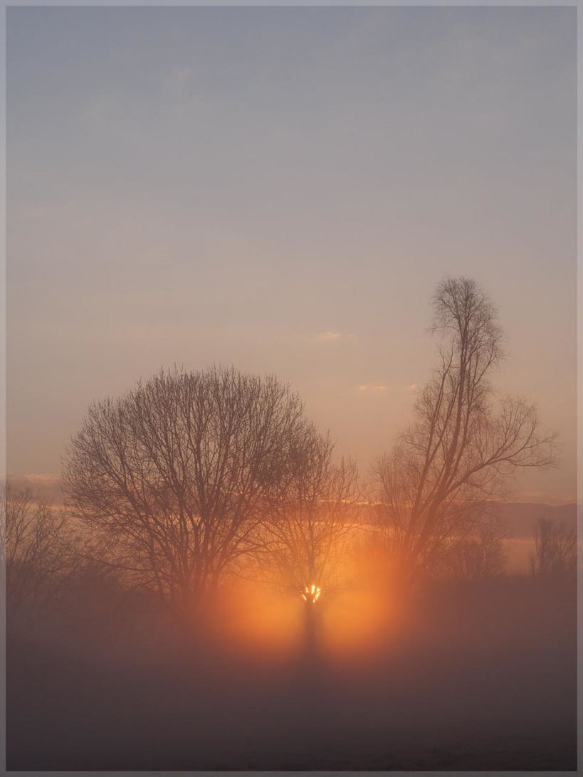 Moin, nach einer kalten Frühlingsnacht habe sich Nebelfelder über der Rur gebildet. Dazu passend geht die Sonne auf und taucht die ganze Szenerie in einen gelb-orange-roten Farbton. Also Kamera raus und Bilder machen