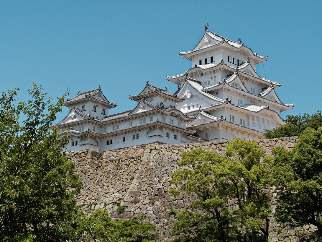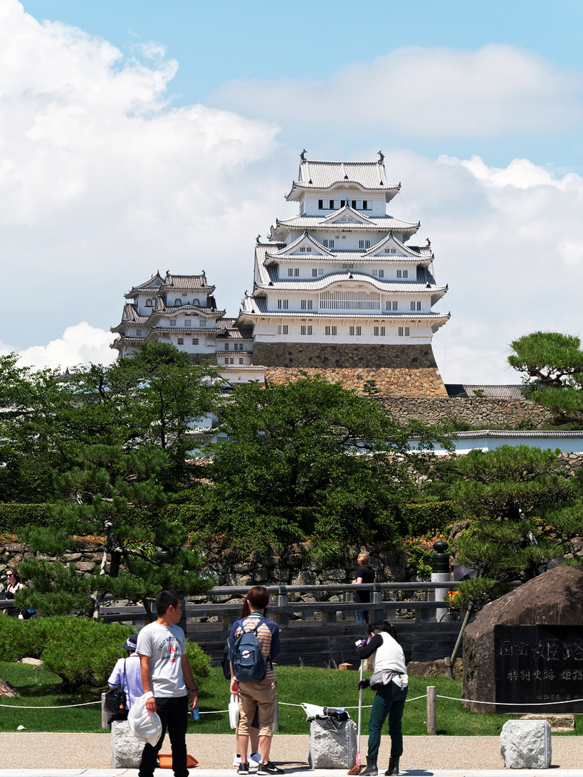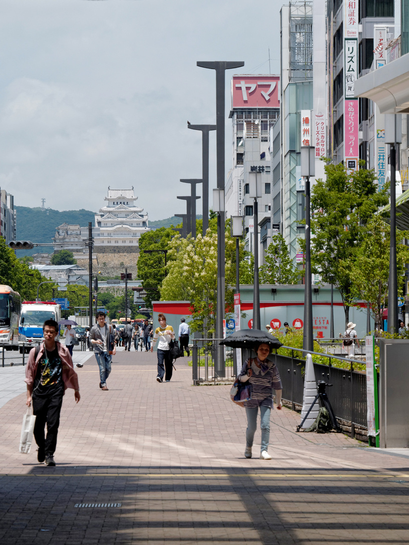 1) Wenn man aus dem Bahnhof von Himeji kommt, muß man niemanden nach dem Weg zum Weißen Schloß (Himeji-jō) fragen. Allerdings verkürzt das Teleobjektiv hier die Entfernung ein wenig. 2) Wenn man dann durch die relativ kleine Stadt durch ist rückt das Schloß (das in Wirklichkeit eine Burg ist) nicht nur per Weitwinkel in größere Entfernung: Früher lag es in der (inneren) Stadt, doch diese wurde im Krieg völlig zerstört und dann ein Stück zur Bahnlinie hin verschoben neu aufgebaut. Da es in Japan heute wenig und 1945 praktisch keine unterirdische Infrastruktur gibt, kommen solche Schiebereien öfter vor. 3-5) Und dann steht man nach Überqueren der in der Brache praktischerweise angelegten Parkplätze davor, und es sieht wirklich aus wie im Bilderbuch. (Alle Aufnahmen mit der Pana GX7 und dem 14-140-II; Fortsetzung folgt)