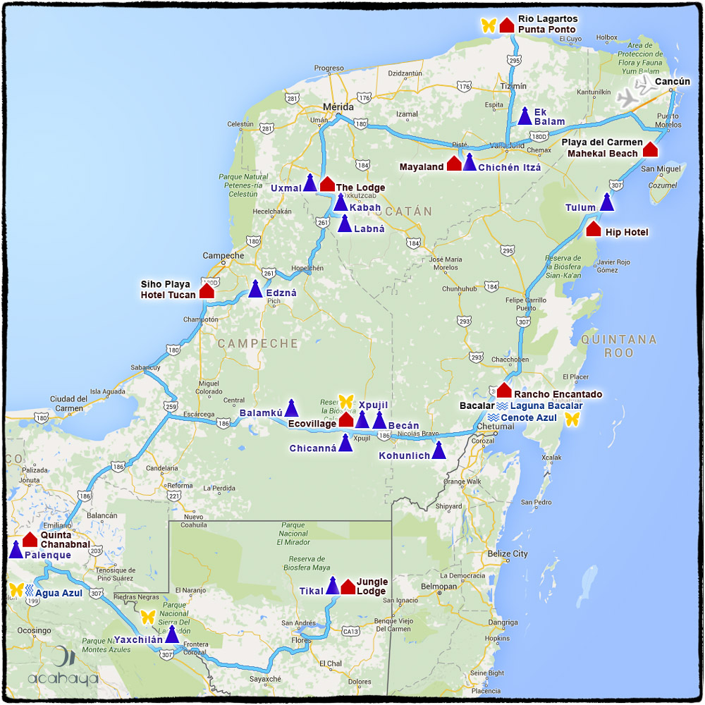 Die schönsten Bilder von dieser Reise habe ich zwar schon längst bearbeitet, meine Eltern haben sich jedoch zu dieses Jahr Weihnachten ein Buch mit einem bebilderten Reisebericht gewünscht und ich dachte mir, während ich dran sitze, könnte ich Teile davon ja auch hier posten. Vielleicht plant ja der eine oder andere von Euch eine ähnliche Reise und kann ein paar der Informationen gebrauchen oder lässt sich inspirieren. Das ist übrigens zumindest für den Anfang KEIN Jekami Thema, wenigstens so lange nicht, bis ich alle meine Reiseetappen gepostet habe, weil das sonst zu durcheinander geht. Die Bilder sind nicht unbedingt wegen des WOW Faktors ausgesucht, sondern oft einfach nur Dokumentation. Ich hoffe, Ihr habt trotzdem Spaß am Lesen. Die große Akropolis von Edzna Vorbereitung und Buchung: Im Februar 2014 konnten mein Mann und ich uns einen lange gehegten Traum erfüllen: Eine Reise nach Mexiko und Guatemala, wo wir uns die Maya Ruinen, von denen wir schon so viel gelesen und im Fernsehen gesehen hatten, endlich selbst ansehen konnten. Ich selbst hatte nach dem Abi ein Praktikum in Mexico City gemacht, war fasziniert auf der Sonnenpyramide von Teotihuacán gestanden und hatte mich damals schon in Land, Leute und das Essen verliebt. Bis in den Süden zu den Maya hatte ich es jedoch nicht geschafft und das sollte sich nun 30 Jahre später und mit einem fließend Spanisch sprechenden Ehemann endlich ändern. Unsere Reiseplanung war notgedrungen recht spontan, da sich erst 4 Wochen vor Abreise herausstellte, dass wir beide wegen in den März verschobener Projektstarts überhaupt Zeit für einen knapp 3-wöchigen Urlaub im Februar hatten. Die ersten Veranstalter, die wir kontaktierten, waren mit der Beratung für eine so kurzfristige Rundreise total überfordert und für die Buchung der diversen „Mundo Maya“ Pauschalreisen wie z.B. von Studiosus war es angeblich bereits zu spät, da die Kontingente 4 Wochen vor Reisebeginn bereits zurückgegeben worden waren. Bei Amérika Andina (https://www.america-andina.de) wurden wir dann aber doch noch fündig und hervorragend beraten. Die können wir also mit gutem Gewissen weiter empfehlen. Wir entschieden uns dafür, mit einem Mietwagen selbst zu fahren und die Hotels, den Mietwagen sowie den Ausflug nach Tikal in Guatemala über Amérika Andina zu buchen und schon von Deutschland aus zu bezahlen. Die Condor Flüge von München nach Cancún organisierten wir selbst und zudem verabredeten wird uns in Tikal mit Dieter Richter von Café Yaxha (http://cafeyaxha.com), dem allerallerbesten Deutsch-sprachigen Führer für Maya-Interessierte, den man sich vorstellen kann. Unsere Reiseroute Unsere Rundreise führte uns entgegen dem Uhrzeigersinn durch die Yucatán Halbinsel, durch Tabasco über Chiapas bis in den Petén in Guatemala und zurück an die Ostküste von Yucatán. Zu den Highlights gehörten der Besuch der berühmten Maya-Stätten von Chichén Itzá, Palenque und Tulum, ein Ausflug zur Königin der Maya Städte Tikal in Guatemala, die Wasserfälle von Agua Azul in den Bergen von Chiapas, die Flamingos in den Salzlagunen von Rio Lagartos und der puderzucker-feine Sandstrand von Tulum. Unsere Reiseroute mit Orten, Hotels, Maya-Stätten und anderen Sehenswürdigkeiten Die gewählte Reiseroute hat uns viele Maya Highlights geboten, dazu ein wenig Natur und ein paar Strandtage, sie war jedoch mit mehr als 2000 km Fahrstrecke in 18 Tagen sehr ehrgeizig und manchmal auch ein wenig anstrengend und dabei haben wir uns noch nicht einmal alles ansehen können, was an der Strecke lag. Heute würden wir folgendes anders machen: Es ist zwar eine gute Idee, sich erst mal einen Tag am Strand zu aklimatisieren, das kann man aber auch in Cancún machen und dort den Mietwagen übernehmen, statt einen Riesenumweg nach Playa del Carmen zu fahren, wenn man danach eigentlich in den Norden will. In Uxmal hätten wir lieber zwei Nächte bleiben sollen, dann wäre am ersten Tag genügend Zeit gewesen, Uxmal zu besichtigen, Puuc Route in aller Ruhe abzufahren und die Höhlen von Loltún zu besuchen und am zweiten Tag hätten wir für die Besichtigung von Edzná mehr als nur eine Stunde Zeit gehabt und am Nachmittag trotzdem noch den schönen Strand des Tucan Hotels am Golf von Mexiko genießen können. So war das alles ein wenig gedrängt.An der Laguna Bacalar hätte uns dagegen vermutlich ein Nachmittag und eine Nacht gereicht. In Palenque hat es uns so gut gefallen, dass wir nach dem ziemlich anstrengenden Ausflug nach Guatemala spontan noch einen Tag länger in der Quinta Chanabnal geblieben sind und dafür sogar auf den Besuch der Maya Stätte Calakmul und auf die erste der beiden bereits bezahlten Übernachtungen im Ecovillage in Cicanná verzichtet haben.Das lag nicht zuletzt auch daran, dass wir es genossen haben, zur Abwechslung mal eine feste Ausflugsbasis zu haben und unsere Taschen auspacken zu können. Das nächste Mal werden wir daher öfters mal mehrere Nächte an einem Ort bleiben, statt fast jede Nacht in einem anderen Hotel. Grundsätzlich hatten wir mit Absicht Übernachtungen in günstig gelegenen Hotels geplant, so dass wir die bekannteren Mayastätten und Parks entweder früh morgens vor der Abreise oder am Nachmittag nach der Ankunft im Hotel und möglichst ohne die tagsüber üblichen Menschenmassen besuchen konnten. Trotzdem mussten wir unser vollgepacktes Auto gelegentlich auch mal unterwegs parken, es ist aber nie etwas passiert und wir würden das auch jederzeit wieder so machen.Alles was wirklich wichtig war, hatten wir sowieso in unseren Foto-Rucksäcken verstaut und die hatten wir immer dabei. Fotoausrüstung Wir wollten nichts mitnehmen, das unersetzlich wäre und gleichzeitig musste unsere Ausrüstung alle Anforderungen von Vögeln und Brüllaffen bis Maya-Architektur abdecken und dabei sowohl tragbar als auch zusammen mit Kleidung für 3 Tage und allem was uns lieb und teuer war, in unseren beiden Foto-Rucksäcken verstaubar sei