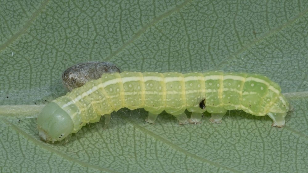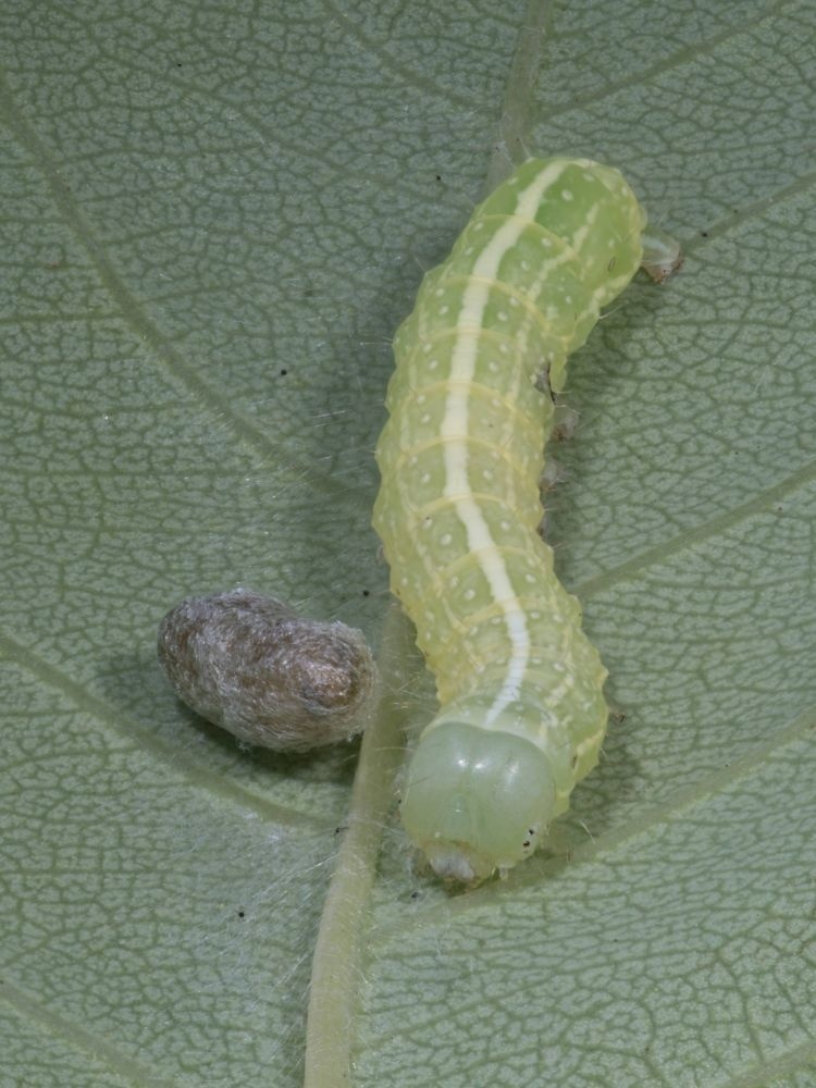 Tag 1: Auffindung Bei der Ernte von Felsenbirnen wird zufällig eine Raupe "mitgeerntet". Sie hält sich an der Unterseite eines Blattes auf. Die Länge beträgt ca. 15mm. Mit dem Kokon nebenan hat sie wohl nichts zu tun. Die Felsenbirnen wurden gepflanzt, es könnte sich auch um eine ausländische Art oder Zuchtform handeln. Der Standort ist im zentralen Niederösterreich. Zur Kandidatin selbst: Unglücklicherweise gibt es hier mindestens zwei Arten, deren Raupen sich nahezu auf's Haar gleichen. Cosmia Pyralina Lithophane Ledereri Es gibt aber subtile Unterschiede: Der Rückenstreifen ist bei Lithophane Ledereri breiter als bei Cosmia Pyralina. Die einzelnen Segmente sind durch einen gelben Rand deutlicher voneinander abgesetzt. Meine erste Diagnose: Lithophane Ledereri, da gibt es keine zweite Meinung. Gibt es doch. Lithophane Ledereri ist vom Südbalkan bis Kleinasien verbreitet. Ein Vorkommen in Mitteleuropa ist nicht dokumentiert. Als Futterpflanze werden verschiedene Platanenarten angegeben. Diese kommen bei uns vorwiegend in Parkanlagen vor. Mir wäre in einem größeren Umkreis keine Platane bekannt. Ich kann es aber auch nicht ausschließen. Cosmia Pyralina aka Violettbraune Ulmeneule wäre hingegen eine heimische Art. Eine Bergulme befindet sich in 20m Entfernung. Diese weist aber keine sichtbare Besiedlung mit Raupen und auch keine relevanten Fraßspuren an den Blättern auf. Auch an den Felsenbirnen finden sich nach stichprobenartiger Kontrolle keine Fraßspuren, insbesondere auch nicht an dem Blatt, an dessen Unterseite die Raupe immer noch sitzt. Allerdings ist das Felsenbirnengestrüpp dicht und es lässt sich nicht mehr feststellen, wo genau die Raupe "geerntet" wurde. Mögliche Erklärungsansätze: Lithophane Ledereri ist nach Norden gewandert. Wer sich in Griechenland wohlgefühlt hat, ist heute in Mitteleuropa nicht fehl am Platz. Ich habe keinen deutschen Namen für die Art gefunden, aber vielleicht brauchen wir bald einen. Die Raupe von Cosmia Pyralina variiert in ihrer Färbung so stark, dass es zu Überdeckungen mit Lithophane Ledereri kommt. Ich kann nicht beurteilen, wie weit die Raupe in ihrer Entwicklung ist und ob sie noch fressen muss. Sonst könnte man sie überwintern und sehen was daraus schlüpft. Ich will aber kein Tier der Natur entnehmen. Ich veröffentliche den Fall in einigen spezialisierten Insektenforen.