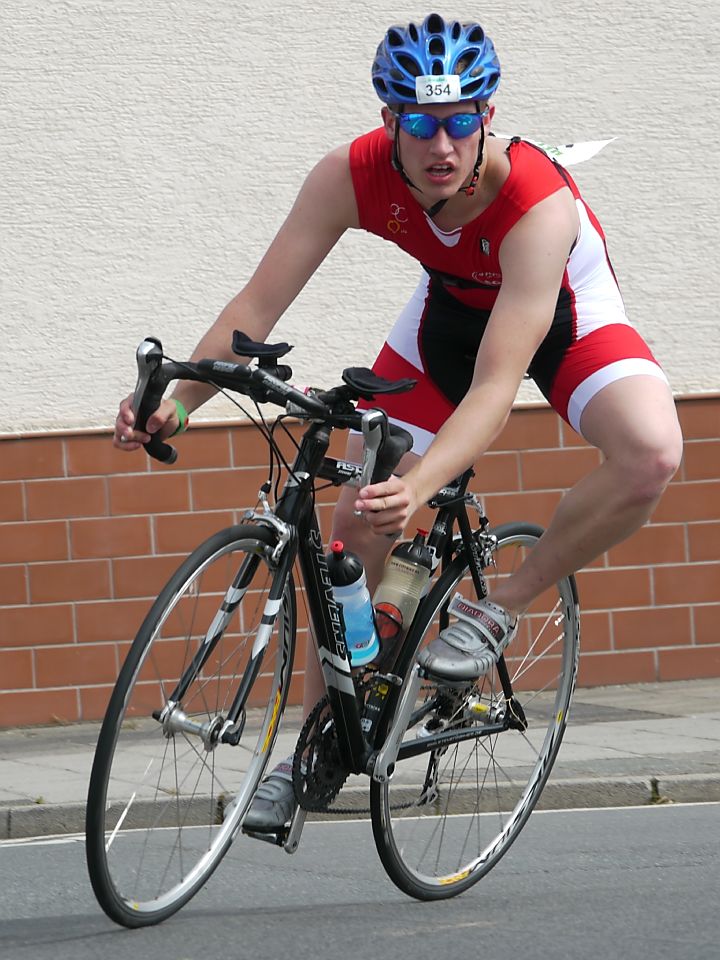 Das Bild zeigt die körperliche und geistige Anspannung eines Triathleten auf dem Rad beim Durchfahren einer Kurve. Leider ist der Hintergrund zu aufdringlich aber die Hauswand ließ sich nicht zurücksetzen GH1 mit Kit-Objektiv 14 - 140 mm, volle Öffnung, 1/500s, Querformat auf Hochformat beschnitten, keine Vergrößerung, keine Bearbeitung