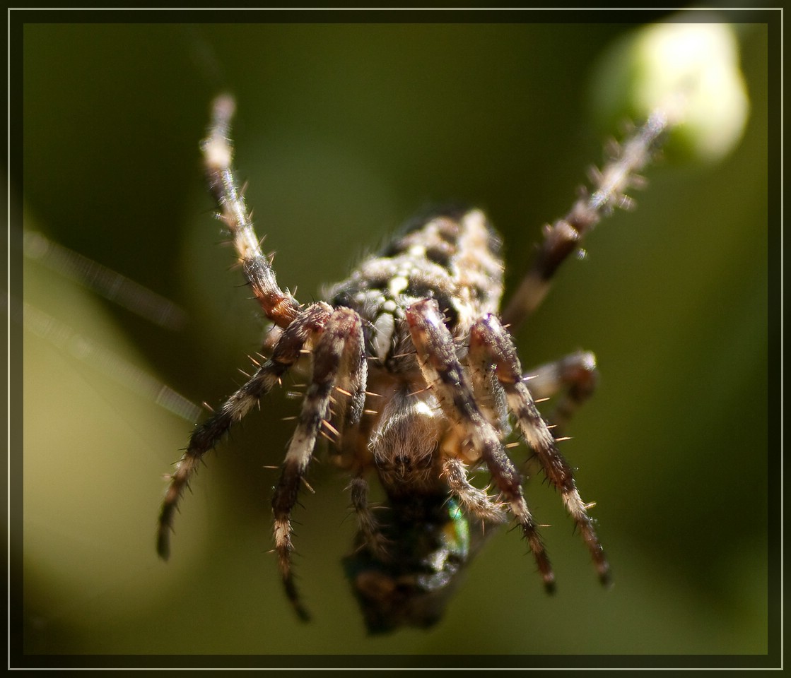 Hallo Nah- und Makro-Fans, durch Eure Spinnereien ermutigt, habe ich es auch mal versucht. Aber das ist wirklich verd.... schwierig. Ich habe das 2,8/90mm Tamron-Makro (Nikon-F-Mount) an die G1 montiert und versucht, die Spinne dabei zu porträtieren, wie sie eine Fliege zum handlichen Vorratspaket verpackt. Diesmal habe ich auch Eure wirklich angemessenen Empfehlungen zum Stativgebrauch erhört damit wenigstens die Kamera einigermaßen fest steht. Aber mit dieser Brennweite ist es bereits eine Herausforderung, die Spinne überhaupt anzuvisieren ! Und wenn man sie dann mal anvisiert hat, stellt man fest, dass man das Stativ verschieben muss - und das Anvisieren beginnt von vorn. Ich muss wohl über einen 2-Wege-Einstellschlitten nachdenken Ich hatte ca. Bl. 8-11 eingestellt, um auf eine akzeptabel kurze Beli.-Zeit zu kommen. Aber die Schärfentiefe ist (no surprise) wirklich wiiiinzig klein. Und entweder weht ein laues Lüftchen die Spinne 3 mm nach vorn oder nach hinten, oder die Fliege zappelt (sehr unkooperativ!). Naja - ich scheue mich dennoch nicht, Euch das mühsam erreichte Resultat (noch eines von den Besseren unter vielen total Unbrauchbaren) - mit PSE7 aus dem RAW-Format herausgearbeitet - zu präsentieren, um auch mal wieder eine mit dem 90er Tamron erstellte Aufnahme einzustellen. Und vielleicht spare ich doch noch auf das 45er Makro von Panasonic - aber das kann dauern ..... Viele Grüße an alle Spinner