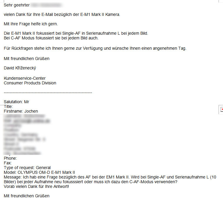 Keiner der genannten Punkte würde mich vom kauf abhalten, aber sie stören mich dennoch. Da Olympus vollmundig angekündigt hat, die E-M1II nachhaltig via Firmware Updates zu pflegen, gilt es, hier und direkt an Olympus seine Probleme zu artikulieren und dem Hersteller entsprechendes Feedback zu geben. Es besteht ja die Chance, dass Änderungswünsche umgesetzt werden. (Allein die Hoffnung lässt mich natürlich kein Produkt kaufen). Also, ran an den Speck, und an Olympus Customer Service schreiben. (Ich hatte kürzlich innerhalb von 24 h eine Antwort erhalten.)
