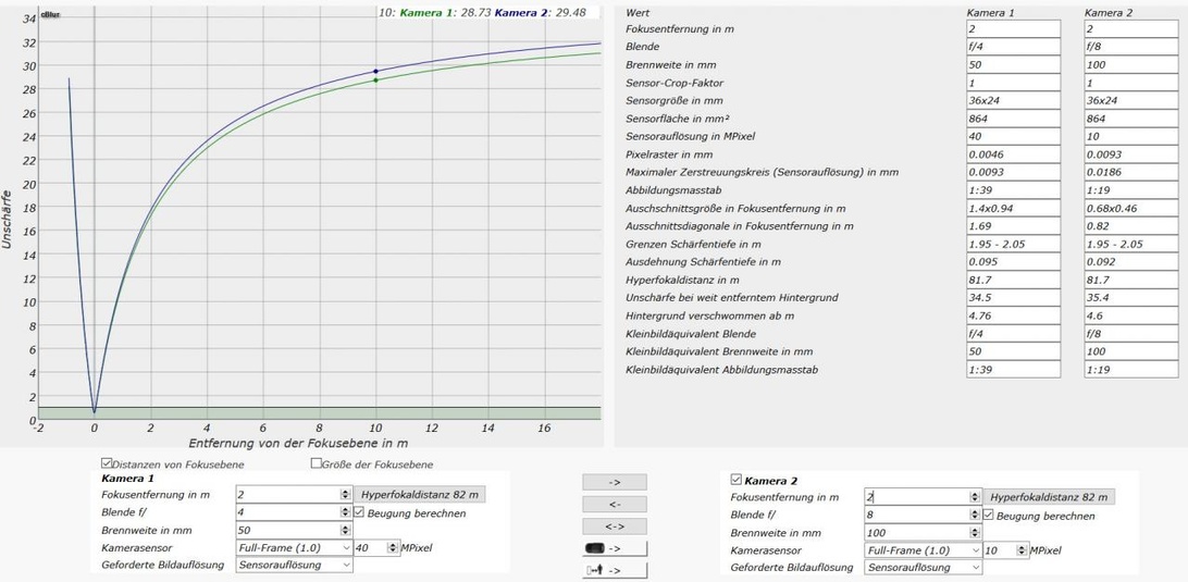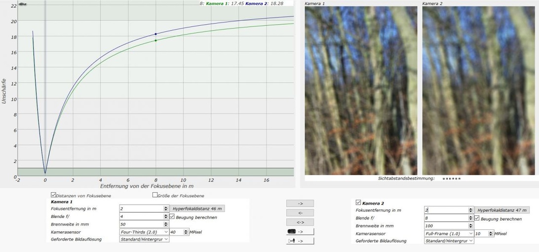 Du legst bei Bild 2 bei beiden Kameras denselben Zerstreuungskreisdurchmesser zugrunde, bei Bild 3 jedoch unterschiedliche (auf verschiedene Sensorauflösungen bezogen). Dadurch alleine ist die Schärfentiefe bereits anders definiert und fällt anders (bzw. hier in der Grafik gleich) aus.