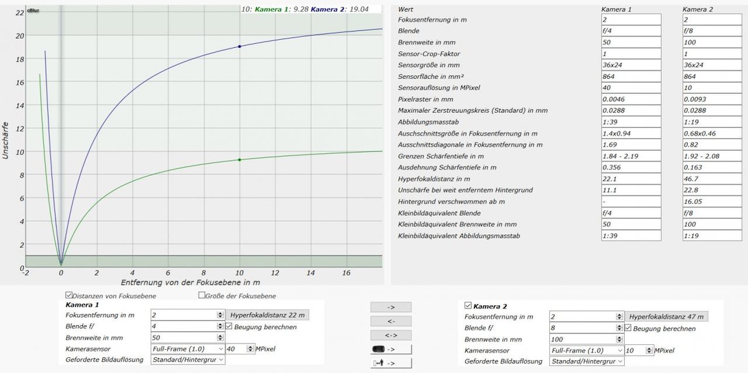 i) Ich nehme eine MFT-Kamera statt KB und fotografiere von 2 Metern Entfernung mit Brennweite 25 mm und Blende 2