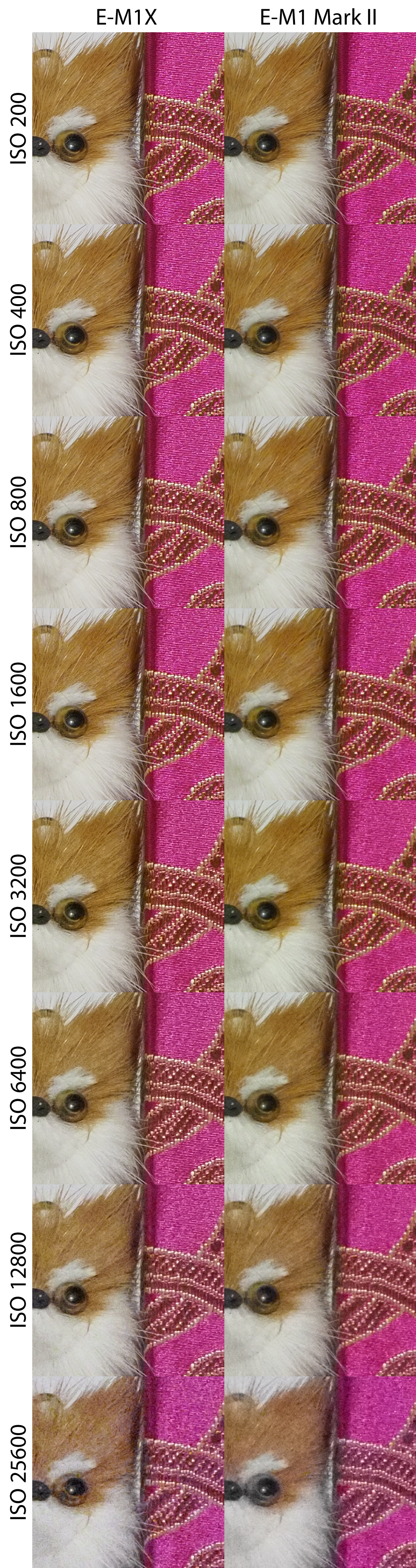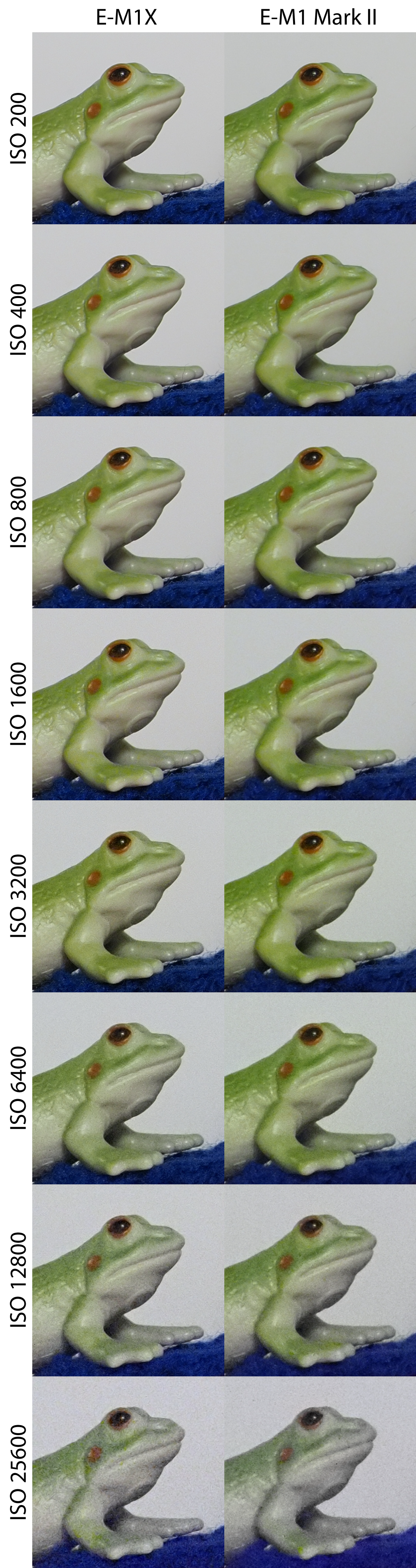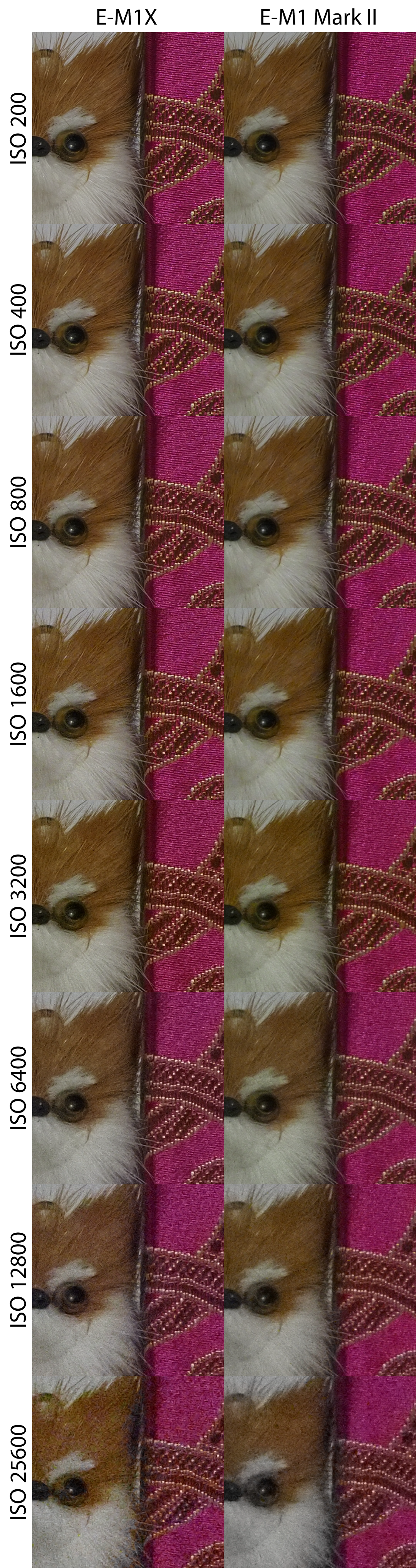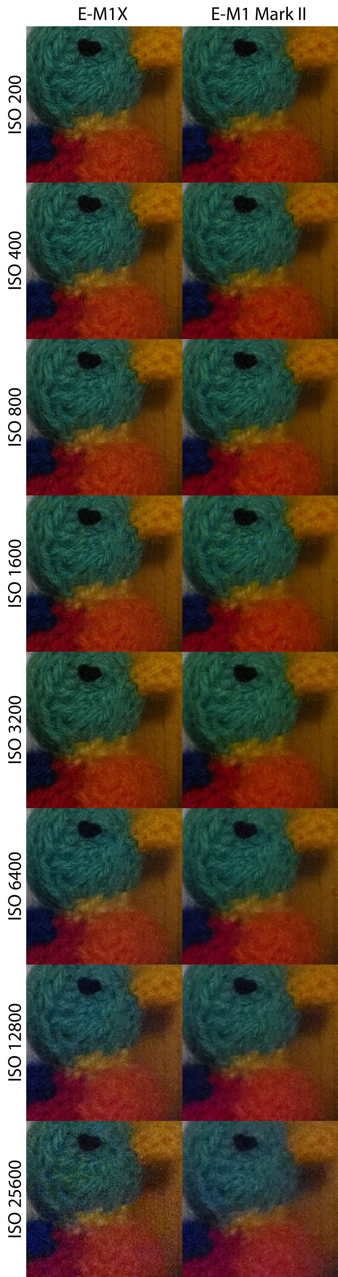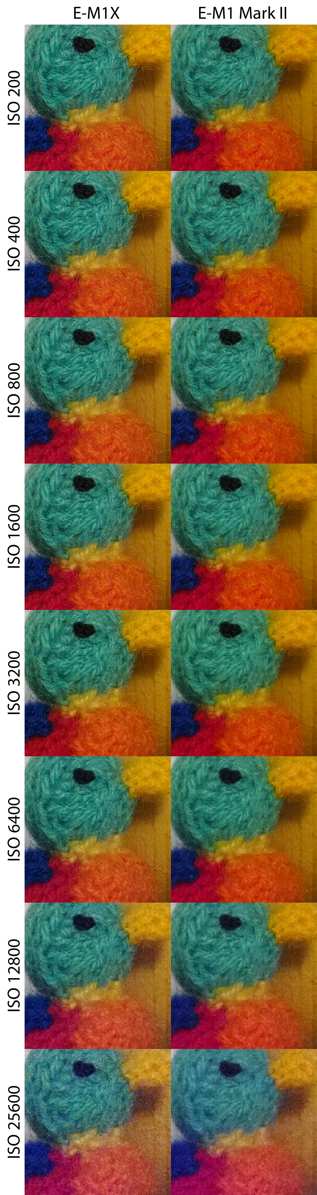 Sascha S. Geschrieben 18. Februar 2019 Autor Share #2 Geschrieben 18. Februar 2019 ISO-Reihen E-M1X (Fw 1.0) im Vergleich zur E-M1 Mark II (Fw 2.1) Die Aufnahmen entstanden unter kontrollierten Lichtbedingungen (Lw 3) mit dem M.Zuiko 40-150 mm f/2,8 PRO bei 40 mm Brennweite und Blende f/8, manuell fokussiert im RAW-Format. Sie wurden über den Olympus Workspace ohne weitere Bildverbesserung (keine Entrauschung, keine Nachbearbeitung) ausgespielt. Hier der gesamte Aufbau: Hallo, lieber Besucher! Als Forumsmitglied (kostet nix) würdest du hier ein Bild sehen… Einfach hier registrieren – Wir freuen uns immer über neue Mitglieder! Daraus wurden drei Bereiche ausgewählt, die sowohl weiche Strukturen (bspw. Fell, Stoff), feine harte Details (bspw. Holz, Kunststoff) wie auch homogene Flächen (Hintergrund) zeigen. Zudem wurde jede Reihe sowohl korrekt belichtet, wie auch um eine Blende unterbelichtet aufgenommen. Hier die Ergebnisse in 100%-Ansicht im direkten Vergleich (zur korrekten Darstellung bitte Klicken): Hallo, lieber Besucher! Als Forumsmitglied (kostet nix) würdest du hier ein Bild sehen… Einfach hier registrieren – Wir freuen uns immer über neue Mitglieder! Hallo, lieber Besucher! Als Forumsmitglied (kostet nix) würdest du hier ein Bild sehen… Einfach hier registrieren – Wir freuen uns immer über neue Mitglieder! Hallo, lieber Besucher! Als Forumsmitglied (kostet nix) würdest du hier ein Bild sehen… Einfach hier registrieren – Wir freuen uns immer über neue Mitglieder! Hallo, lieber Besucher! Als Forumsmitglied (kostet nix) würdest du hier ein Bild sehen… Einfach hier registrieren – Wir freuen uns immer über neue Mitglieder! Hallo, lieber Besucher! Als Forumsmitglied (kostet nix) würdest du hier ein Bild sehen… Einfach hier registrieren – Wir freuen uns immer über neue Mitglieder! Hallo, lieber Besucher! Als Forumsmitglied (kostet nix) würdest du hier ein Bild sehen… Einfach hier registrieren – Wir freuen uns immer über neue Mitglieder! Hallo, lieber Besucher! Als Forumsmitglied (kostet nix) würdest du hier ein Bild sehen… Einfach hier registrieren – Wir freuen uns immer über neue Mitglieder! Hallo, lieber Besucher! Als Forumsmitglied (kostet nix) würdest du hier ein Bild sehen… Einfach hier registrieren – Wir freuen uns immer über neue Mitglieder! Die (aus Testgründen) beschnittenen Aufnahmen in voller Auflösung (ausgespielt über den Olympus Workspace, s.o., gespeichert als PNG) können unter dem folgenden Link abgerufen werden: E-M1X, ISO 200, Belichtung 0 EV (PNG, ca. 12MB)E-M1-2, ISO 200, Belichtung 0 EV (PNG, ca. 12MB)E-M1X, ISO 200, Belichtung -1 EV (PNG, ca. 12MB)E-M1-2, ISO 200, Belichtung -1 EV (PNG, ca. 12MB)E-M1X, ISO 400, Belichtung 0 EV (PNG, ca. 12MB)E-M1-2, ISO 400, Belichtung 0 EV (PNG, ca. 12MB)E-M1X, ISO 400, Belichtung -1 EV (PNG, ca. 12MB)E-M1-2, ISO 400, Belichtung -1 EV (PNG, ca. 12MB)E-M1X, ISO 800, Belichtung 0 EV (PNG, ca. 12MB)E-M1-2, ISO 800, Belichtung 0 EV (PNG, ca. 12MB)E-M1X, ISO 800, Belichtung -1 EV (PNG, ca. 12MB)E-M1-2, ISO 800, Belichtung -1 EV (PNG, ca. 12MB)E-M1X, ISO 1600, Belichtung 0 EV (PNG, ca. 12MB)E-M1-2, ISO 1600, Belichtung 0 EV (PNG, ca. 12MB)E-M1X, ISO 1600, Belichtung -1 EV (PNG, ca. 12MB)E-M1-2, ISO 1600, Belichtung -1 EV (PNG, ca. 12MB)E-M1X, ISO 3200, Belichtung 0 EV (PNG, ca. 12MB)E-M1-2, ISO 3200, Belichtung 0 EV (PNG, ca. 12MB)E-M1X, ISO 3200, Belichtung -1 EV (PNG, ca. 12MB)E-M1-2, ISO 3200, Belichtung -1 EV (PNG, ca. 12MB)E-M1X, ISO 6400, Belichtung 0 EV (PNG, ca. 12MB)E-M1-2, ISO 6400, Belichtung 0 EV (PNG, ca. 12MB)E-M1X, ISO 6400, Belichtung -1 EV (PNG, ca. 12MB)E-M1-2, ISO 6400, Belichtung -1 EV (PNG, ca. 12MB)E-M1X, ISO 12800, Belichtung 0 EV (PNG, ca. 12MB)E-M1-2, ISO 12800, Belichtung 0 EV (PNG, ca. 12MB)E-M1X, ISO 12800, Belichtung -1 EV (PNG, ca. 12MB)E-M1-2, ISO 12800, Belichtung -1 EV (PNG, ca. 12MB)E-M1X, ISO 25600, Belichtung 0 EV (PNG, ca. 12MB)E-M1-2, ISO 25600, Belichtung 0 EV (PNG, ca. 12MB)E-M1X, ISO 25600, Belichtung -1 EV (PNG, ca. 12MB)E-M1-2, ISO 25600, Belichtung -1 EV (PNG, ca. 12MB) shutter button, SGW1, Hans i.G. und 10 weitere haben darauf reagiert 7 6 Link zum Beitrag Auf anderen Seiten teilen More sharing options...