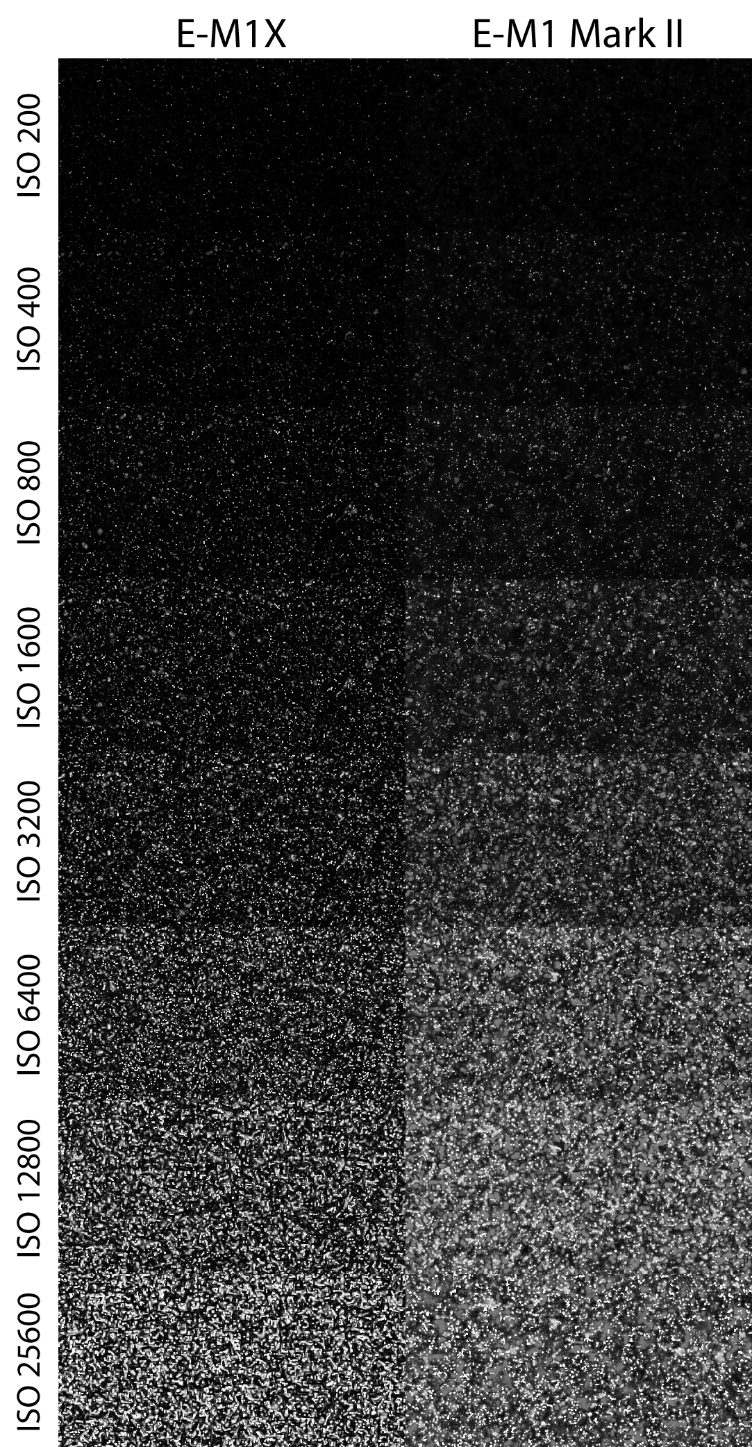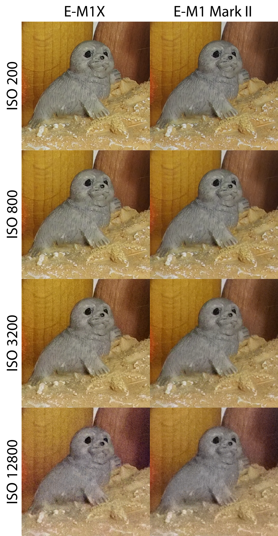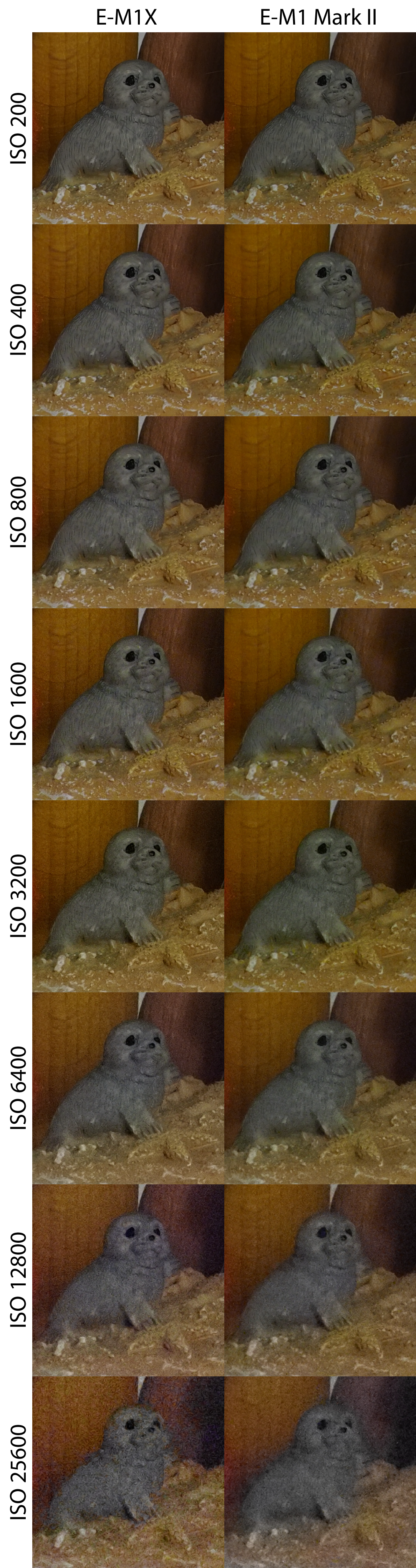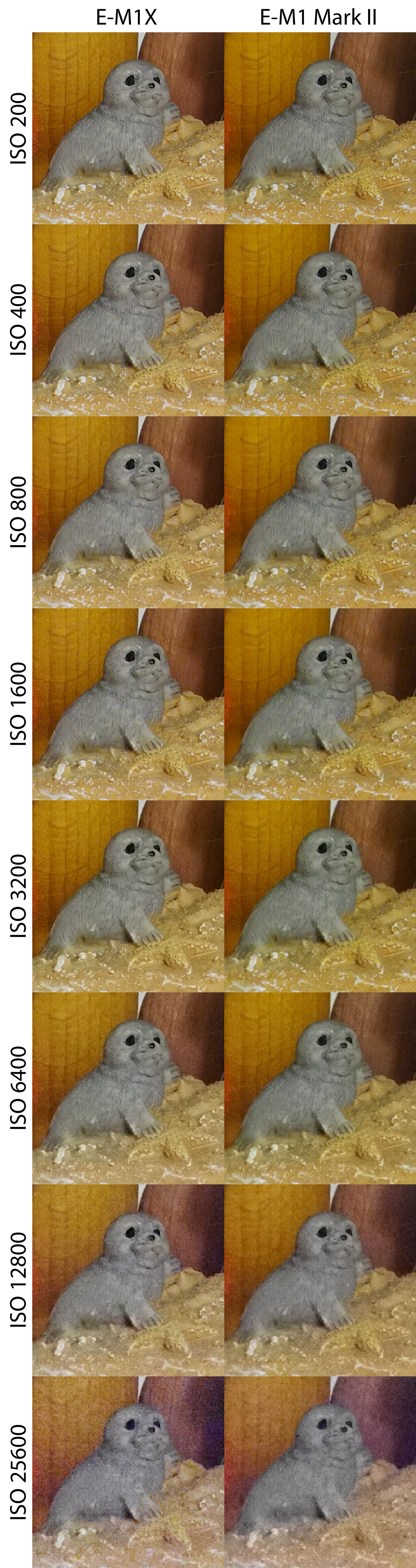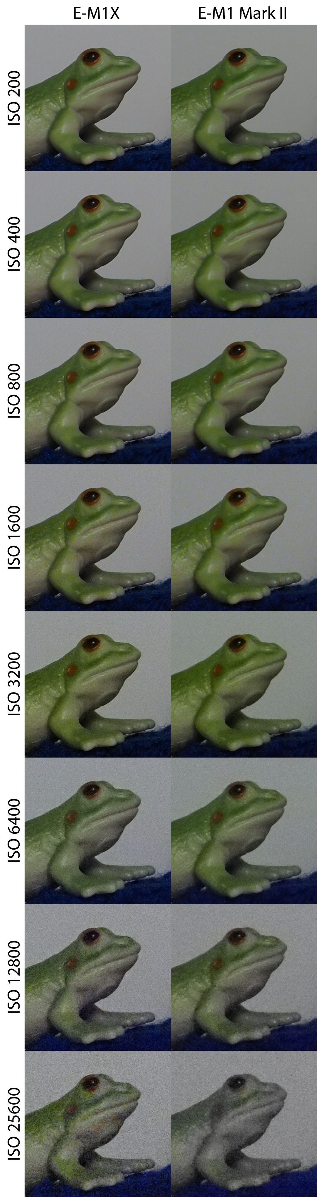 Sascha S. Geschrieben 18. Februar 2019 Autor Share #2 Geschrieben 18. Februar 2019 ISO-Reihen E-M1X (Fw 1.0) im Vergleich zur E-M1 Mark II (Fw 2.1) Die Aufnahmen entstanden unter kontrollierten Lichtbedingungen (Lw 3) mit dem M.Zuiko 40-150 mm f/2,8 PRO bei 40 mm Brennweite und Blende f/8, manuell fokussiert im RAW-Format. Sie wurden über den Olympus Workspace ohne weitere Bildverbesserung (keine Entrauschung, keine Nachbearbeitung) ausgespielt. Hier der gesamte Aufbau: Hallo, lieber Besucher! Als Forumsmitglied (kostet nix) würdest du hier ein Bild sehen… Einfach hier registrieren – Wir freuen uns immer über neue Mitglieder! Daraus wurden drei Bereiche ausgewählt, die sowohl weiche Strukturen (bspw. Fell, Stoff), feine harte Details (bspw. Holz, Kunststoff) wie auch homogene Flächen (Hintergrund) zeigen. Zudem wurde jede Reihe sowohl korrekt belichtet, wie auch um eine Blende unterbelichtet aufgenommen. Hier die Ergebnisse in 100%-Ansicht im direkten Vergleich (zur korrekten Darstellung bitte Klicken): Hallo, lieber Besucher! Als Forumsmitglied (kostet nix) würdest du hier ein Bild sehen… Einfach hier registrieren – Wir freuen uns immer über neue Mitglieder! Hallo, lieber Besucher! Als Forumsmitglied (kostet nix) würdest du hier ein Bild sehen… Einfach hier registrieren – Wir freuen uns immer über neue Mitglieder! Hallo, lieber Besucher! Als Forumsmitglied (kostet nix) würdest du hier ein Bild sehen… Einfach hier registrieren – Wir freuen uns immer über neue Mitglieder! Hallo, lieber Besucher! Als Forumsmitglied (kostet nix) würdest du hier ein Bild sehen… Einfach hier registrieren – Wir freuen uns immer über neue Mitglieder! Hallo, lieber Besucher! Als Forumsmitglied (kostet nix) würdest du hier ein Bild sehen… Einfach hier registrieren – Wir freuen uns immer über neue Mitglieder! Hallo, lieber Besucher! Als Forumsmitglied (kostet nix) würdest du hier ein Bild sehen… Einfach hier registrieren – Wir freuen uns immer über neue Mitglieder! Hallo, lieber Besucher! Als Forumsmitglied (kostet nix) würdest du hier ein Bild sehen… Einfach hier registrieren – Wir freuen uns immer über neue Mitglieder! Hallo, lieber Besucher! Als Forumsmitglied (kostet nix) würdest du hier ein Bild sehen… Einfach hier registrieren – Wir freuen uns immer über neue Mitglieder! Die (aus Testgründen) beschnittenen Aufnahmen in voller Auflösung (ausgespielt über den Olympus Workspace, s.o., gespeichert als PNG) können unter dem folgenden Link abgerufen werden: E-M1X, ISO 200, Belichtung 0 EV (PNG, ca. 12MB)E-M1-2, ISO 200, Belichtung 0 EV (PNG, ca. 12MB)E-M1X, ISO 200, Belichtung -1 EV (PNG, ca. 12MB)E-M1-2, ISO 200, Belichtung -1 EV (PNG, ca. 12MB)E-M1X, ISO 400, Belichtung 0 EV (PNG, ca. 12MB)E-M1-2, ISO 400, Belichtung 0 EV (PNG, ca. 12MB)E-M1X, ISO 400, Belichtung -1 EV (PNG, ca. 12MB)E-M1-2, ISO 400, Belichtung -1 EV (PNG, ca. 12MB)E-M1X, ISO 800, Belichtung 0 EV (PNG, ca. 12MB)E-M1-2, ISO 800, Belichtung 0 EV (PNG, ca. 12MB)E-M1X, ISO 800, Belichtung -1 EV (PNG, ca. 12MB)E-M1-2, ISO 800, Belichtung -1 EV (PNG, ca. 12MB)E-M1X, ISO 1600, Belichtung 0 EV (PNG, ca. 12MB)E-M1-2, ISO 1600, Belichtung 0 EV (PNG, ca. 12MB)E-M1X, ISO 1600, Belichtung -1 EV (PNG, ca. 12MB)E-M1-2, ISO 1600, Belichtung -1 EV (PNG, ca. 12MB)E-M1X, ISO 3200, Belichtung 0 EV (PNG, ca. 12MB)E-M1-2, ISO 3200, Belichtung 0 EV (PNG, ca. 12MB)E-M1X, ISO 3200, Belichtung -1 EV (PNG, ca. 12MB)E-M1-2, ISO 3200, Belichtung -1 EV (PNG, ca. 12MB)E-M1X, ISO 6400, Belichtung 0 EV (PNG, ca. 12MB)E-M1-2, ISO 6400, Belichtung 0 EV (PNG, ca. 12MB)E-M1X, ISO 6400, Belichtung -1 EV (PNG, ca. 12MB)E-M1-2, ISO 6400, Belichtung -1 EV (PNG, ca. 12MB)E-M1X, ISO 12800, Belichtung 0 EV (PNG, ca. 12MB)E-M1-2, ISO 12800, Belichtung 0 EV (PNG, ca. 12MB)E-M1X, ISO 12800, Belichtung -1 EV (PNG, ca. 12MB)E-M1-2, ISO 12800, Belichtung -1 EV (PNG, ca. 12MB)E-M1X, ISO 25600, Belichtung 0 EV (PNG, ca. 12MB)E-M1-2, ISO 25600, Belichtung 0 EV (PNG, ca. 12MB)E-M1X, ISO 25600, Belichtung -1 EV (PNG, ca. 12MB)E-M1-2, ISO 25600, Belichtung -1 EV (PNG, ca. 12MB) shutter button, SGW1, Hans i.G. und 10 weitere haben darauf reagiert 7 6 Link zum Beitrag Auf anderen Seiten teilen More sharing options...