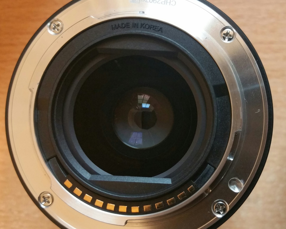Das gehört jetzt zwar nicht zum 1.8/45 aber zu Samyang.... hier mal ein Bild der Hinterlinsenfassung eines anderen Samyang-Objektivs für FE, das ich gerade erhalten habe. Das AF-Tracking funkioniert trotz "Dual Linear Sonic Motor (Ultraschallmotor) und neuester Firmware auch nur mangelhaft, kein Vergleich zu einem FE-Objektiv von Sony.