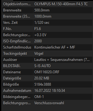 Dennoch ist die OM-1 eine wirklich tolle Kamera, die viel AF Potential hat. Und ich hoffe, das OMDS dieses Potential mit (weiteren) Firmwareupdates hebt. Denn die Voraussetzungen für mft (für Wildlife etc.) sind besser denn je! Die passenden Teleobjektive sind jetzt da und der Sensor ist Spitzenklasse.