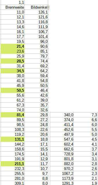 RoDo Geschrieben 24. Juni 2022 Share #33 Geschrieben 24. Juni 2022 Noch etwas Mathe: Folgt man den Darstellungen in WP über den Bildwinkel und wirft dann ein Spreadsheet an, um eine dichtere Aufstellung über die Funktion Bildwinkel von Brennweite (bei KB) zu erhalten, dann ergibt sich: Hallo, lieber Besucher! Als Forumsmitglied (kostet nix) würdest du hier ein Bild sehen… Einfach hier registrieren – Wir freuen uns immer über neue Mitglieder! Die Brennweiten sind um jeweils 10 % (Faktor 1,1 auf die vorherige) gesteigert, mit (willkürlichen) 11 mm als Startwert. Mein stärkstes WW hat 21 mm. Die meist verbreiteten Brennweiten sind hervorgehoben: 21 - 24 - 35 - 50 - 80 - 135 - 200. Man sieht im WW-Bereich, wie dicht die Brennweiten liegen, während ab 50 mm eine Fünfer-Stufung vorliegt. Auch der sehr verbreitete Zoom-Bereich 80 - 210 findet sich. Man sieht auch, dass im Telebereich 200 auf 500 wachsen muss, um die Vergrößerung in etwa zu verdoppeln. Das beantwortet m. E. die Thread-Frage "Woher kommen die Brennweitenstufen" Link zum Beitrag Auf anderen Seiten teilen More sharing options...
