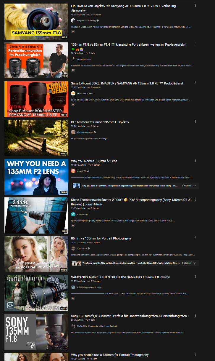 Bambusbaer Geschrieben 23. Juni 2022 Autor Share #26 Geschrieben 23. Juni 2022 Werbung (verschwindet nach Registrierung) vor 4 Stunden schrieb grillec: Ich brauche nur 135mm in YT einzugeben und sehe, dass die gängigen Influencer im Bereich Foto dies nicht links liegen lassen Hallo, lieber Besucher! Als Forumsmitglied (kostet nix) würdest du hier ein Bild sehen… Einfach hier registrieren – Wir freuen uns immer über neue Mitglieder! Hm .... da gibt es noch viel mehr, wenn man neben SOny noch die Dritt-Hersteller dazunimmt. Interessant ist, dass das Samyang 135 1.8AF zunächst von "un-gängigen" Influencern promotet wurde ... und der "aktivste" aus D hat es dafür noch gar nicht in den Fingern gehabt - oder zumindest nix rausgelassen Auch da ändert sich anscheinend etwas... Naja - das war ja ein interessanter Ausflug in die 135er Welt. Irgendwie ging es ja um die Abstufungen in den Brennweiten-Reihen bzw. die "Variationen" einzelner Brennweiten. Danke für die bisherigen Ausführungen. Weiter gehts ... Link zum Beitrag Auf anderen Seiten teilen More sharing options...