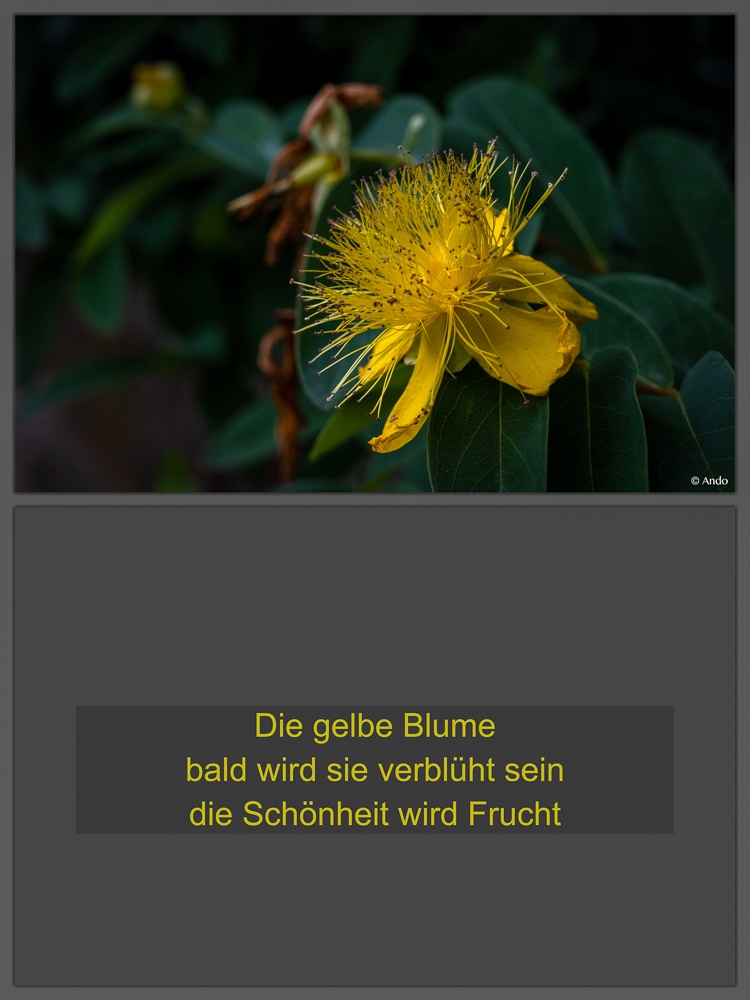 Andi.W Geschrieben 11. Juli 2021 Share #4365 Geschrieben 11. Juli 2021 vor 3 Stunden schrieb lefou: Ist 5/6/5, wie wär's mit "bald schon..." Sry für's Klugsch**** Du hast recht, mir ist eine Silbe verloren gegangen! Leider kann ich es nicht mehr korrigieren, aber hier nochmal die lefou`sche Version: Die gelbe Blume bald schon wird sie verblüht sein Die Schönheit wird Frucht lefou, Lynx und sternenwolf haben darauf reagiert 3 Link zum Beitrag Auf anderen Seiten teilen More sharing options...