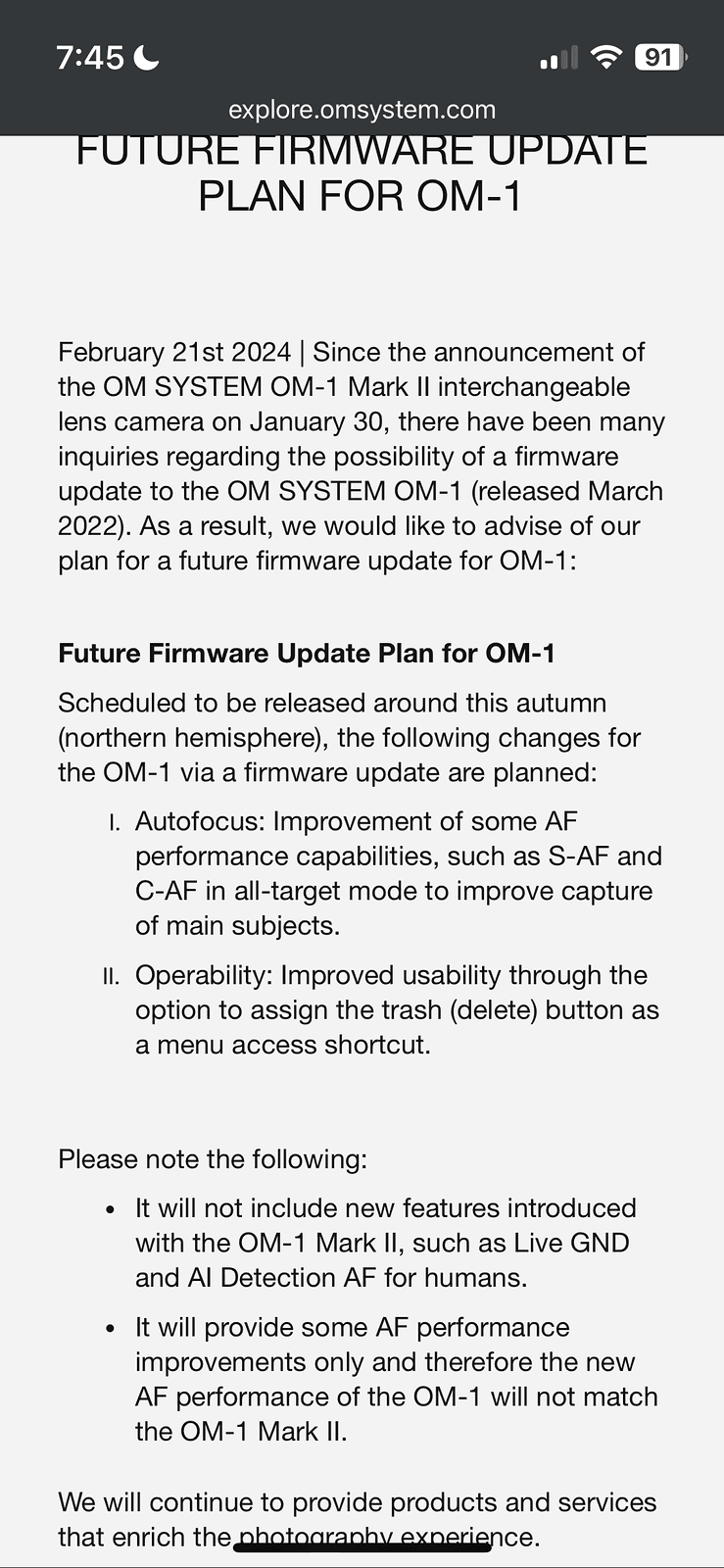 mikuz Geschrieben 30. Januar 2024 Share #15 Geschrieben 30. Januar 2024 vor 2 Stunden schrieb WRDS: Dann hoffe ich mal, dass dies per Firmwareupdate auch bei der OM-1 nachgereicht wird. Sonst wird sich der Kundenstamm von OM System eher kurz- als mittelfristig verkleinern. Das hatte ich auch mal bei der A7 III, A7 IV, A7RIV, A7C, R6, Z6II, Z7II; Fuji Xy ,,,,,,,, gehofft..... pizzastein, Rob, x_holger und 6 weitere haben darauf reagiert 4 5 Link zum Beitrag Auf anderen Seiten teilen More sharing options...