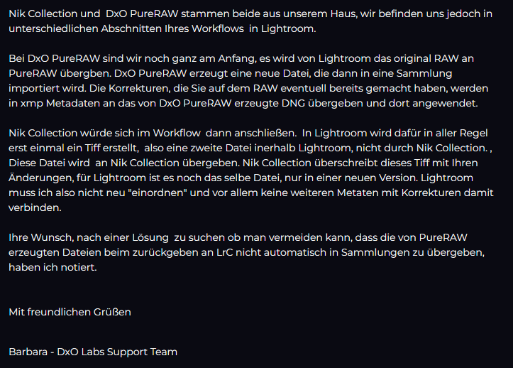 wasabi65 Geschrieben 7. Oktober 2024 Share #40 Geschrieben 7. Oktober 2024 (bearbeitet) Danke fürs Update. DxO liegt halt schon daneben, wenn sie behaupten, dass es in LrC zum Konzept gehört, dass bearbeitete Fotos in separate Sammlungen landen. Das ist bei keinem Plugin so, ausser DxO. Ich kann das bestätigen für Ps, alle Topaz, PanoStudio, Helicon und die NIK tools (die ja heute bei DxO sind…). bearbeitet 7. Oktober 2024 von wasabi65 pflaf hat darauf reagiert 1 Link zum Beitrag Auf anderen Seiten teilen More sharing options...