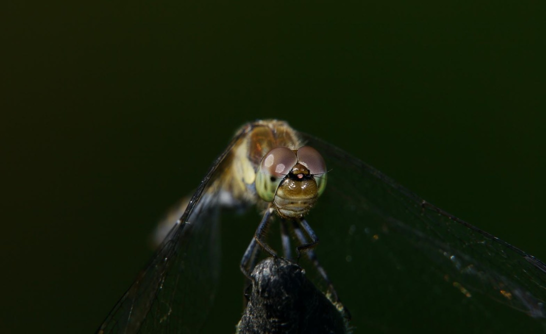 Da kann man das Bild auch in Originalgröße und ungeschnitten ansehen und sieht dann, dass die 3 Ocellen auf dem Fligenkopf auch Freihand aber natürlich mit Blitz scharf werden können, auch wenn man mit Brille über den Sucher fokussiert - wenn die Optik denn dafür die Voraussetzungen bietet