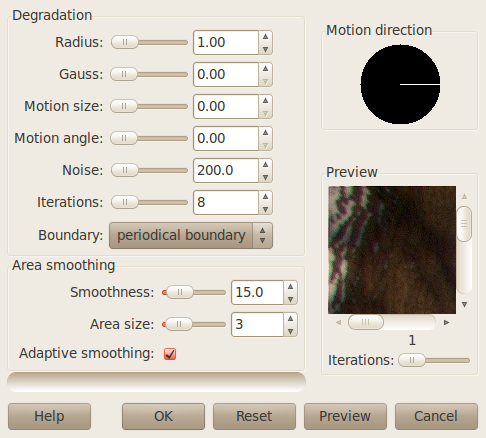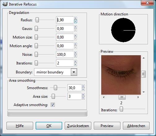 ecle Posted February 6, 2011 Share #23 Posted February 6, 2011 matadoerle: Ich würde unbedingt den Threshold ausschalten. Dadurch entstehen meiner Meinung nach die meisten Artefakte. Es ist halt kein gleitender Übergang was sehr unnatürlich aussieht. Ich würde den Wert immer auf 0 setzen, außer wenn man Rauschprobleme hat. Hier ein Bild aus Focus Magic: Amount 100%, Width 1 (kann man direkt mit meinem zuvor geposteten Bild vergleichen) http://dl.dropbox.com/u/3083419/focus%20magic.jpg Sieht sehr ähnlich aus. Offensichtlich steckt der gleiche Algorithmus drinne. Mit RL kann man jedoch mit maximaler Iteration noch mehr feine Details rausholen. Link to post Share on other sites More sharing options...