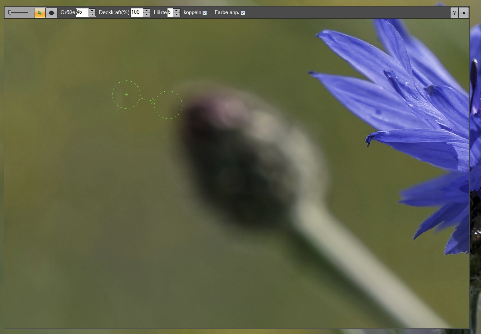 Mit einem Druck auf das Mausrad öffnest Du das Lupenfenster, und mit dem Stempelsymbol den Kopierstempel. Der Haken bei "Farbe anpassen" stellt sicher, dass nicht hart kopiert, sondern retuschiert wird. Mit der Strg-Taste kannst Du den Quellbereich festhalten bzw. Abstand und Lage zwischen Quelle und Ziel verändern. Beim Festhalten der Shift-Taste lässt sich ein ganzer Bereich kopieren bzw. reparieren, mit Strg und Shift sogar den Bereich mit einer einheitlichen Farbe füllen. Alle Zwischenschritte lassen sich mit dem Schieber links oben zurückrufen.