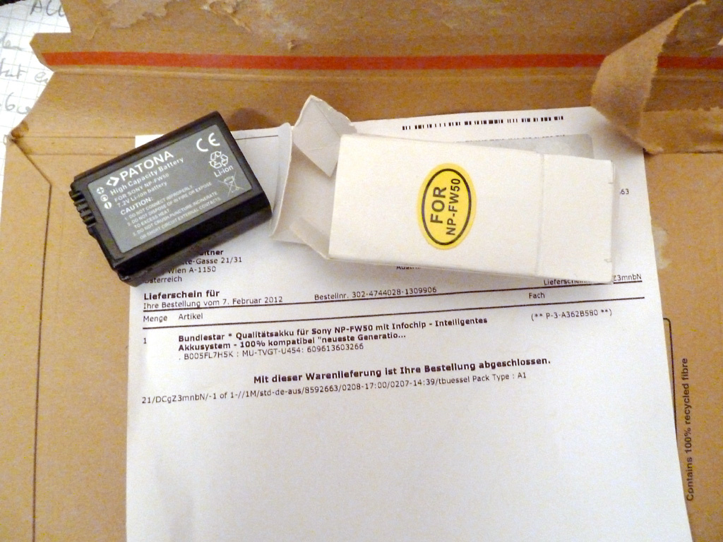 Gast Geschrieben 22. Februar 2012 Share #64 Geschrieben 22. Februar 2012 Meiner aus der Bucht für 11,95€ (incl. Versand) läuft einwandfrei, ist mit Chip und erscheint auch im Display, die Haltbarkeit auf Dauer wird sich zeigen, aber für das Geld, was solls...Verkäufername Ebay: handy-foto-pc Selbiger Verkäufer bietet auch bei Amazon an, da jedoch für 15,90€ Amazon Name: vhbw oder einfach mal nach: B & W Handelsgesellschaft googlen. Danke, diese Akkus sind inzwischen sogar noch billiger, und das Beste: sie funktionieren tatsächlich hervorragend in meiner NEX-5N, im Gegensatz zu einem anderen, den ich zuerst bestellt hatte (MQ-Power) und wieder zurück schicken musste. Link zum Beitrag Auf anderen Seiten teilen More sharing options...