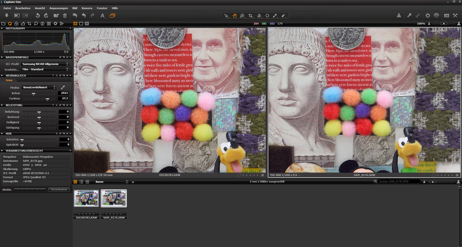 Gorgeous188 Geschrieben 10. November 2011 Share #17 Geschrieben 10. November 2011 Solche Bilder sind für einen Vergleich nur bedingt geeignet. Die Größe, Ausschnitt und sogar die Perspektive (Kamera wurde bewegt) unterscheidet sich bei beiden Aufnahmen. Dass man sogar bei der NX10 aus ISO3200 noch einiges rausholen kann, hat snowdream bereits Anfang des Jahres bewiesen: https://www.systemkamera-forum.de/samsung-nx-kamera-technik/14738-available-light-shots.html#post115704 Deswegen sind auch "Default Einstellungen" nicht einfach verwendbar, für jedes Bild muss einzeln an den Reglern gedreht werden. Link zum Beitrag Auf anderen Seiten teilen More sharing options...
