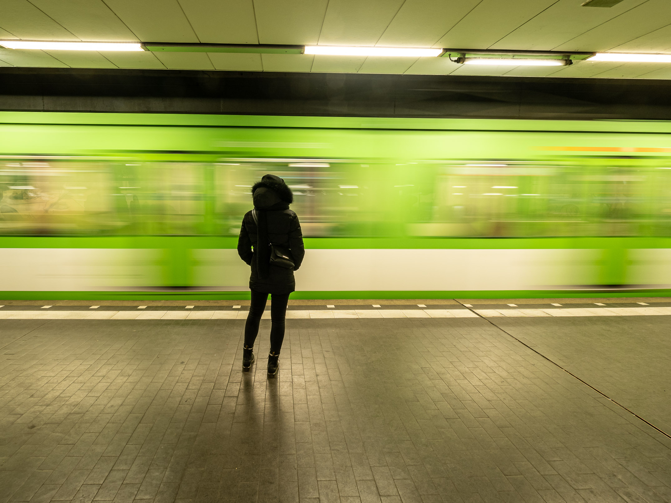 Es wurde erwähnt das Street häufig spontan gemacht wird, fast schnappschussartig (was nicht negativ ist). Auch ich mache das gelegentlich. Siehe das Beispiel im Anhang (Glück gehabt). Aber oft suche ich einen Ort je nach Hintergrund und warte. Manchmal 10 Minuten, manchmal eine Stunde. Das hat den Vorteil der bewussten Komposition und schult auch für Spontane Situationen das Unterbewusstsein, für eine gute Komposition.