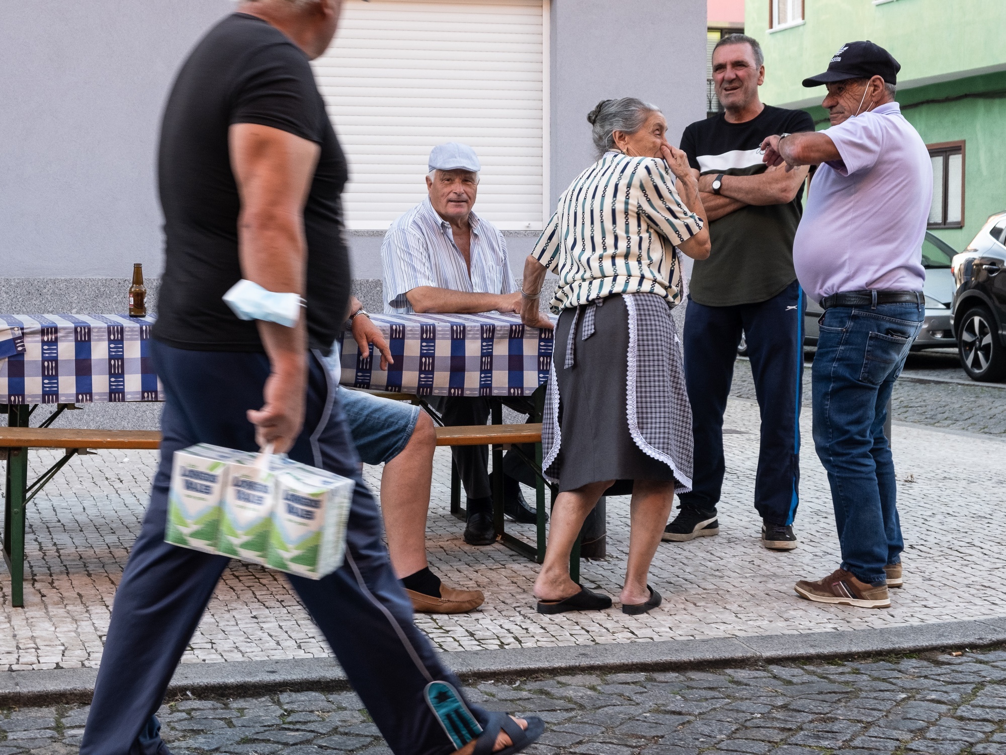Ich liebe solche Szenen, insbesondere mit älteren Menschen. Blickkontakt ist wichtig, anscheinend Menschen die sich kennen und wie es im Süden üblich ist, spielt sich das Leben auf der Straße ab. Die Bewegungsdynamik im Vordergrund, mit Blick auf die "Nachbarn" bringt etwas Schwung rein, in eine sonst statische Situation. Das dritte Bein irritiert einerseits, regt aber auch zu Spekulation über die Person an. Deine sitzende Perspektive oder auch Hüftschuss ? passt und erzeugt nicht das Gefühl der Heimlichtuerei.
