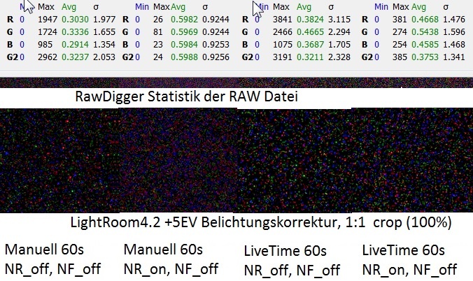 Noise Reduction/Noise Filter abgeschaltet (was bei RAW ja egal sein sollte)